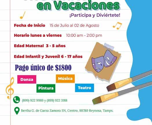 La Casa de la Cultura de Reynosa A.C., que dirige Mirella Lucero Guzmán, invita a su tradicional curso de verano, con el propósito de que niños y jóvenes puedan disfrutar de las diferentes clases disponibles durante tres semanas de lunes a viernes.