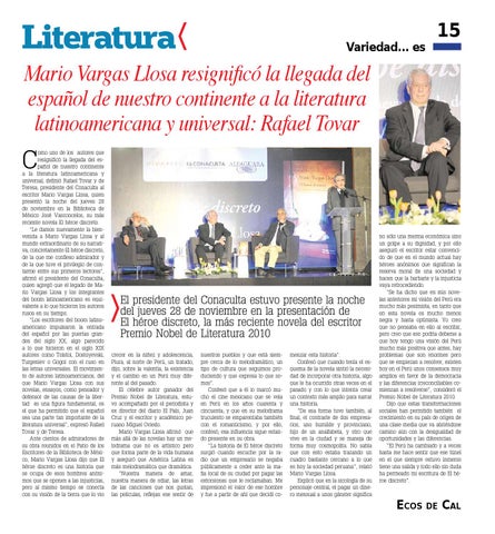El presidente del Conaculta estuvo presente la noche del jueves 28 de noviembre en la presentación de El héroe discreto, la más reciente novela del escritor Premio Nobel de Literatura 2010 crecer en la niñez y adolescencia, Piura, al norte de Perú, un tratado, dijo, sobre la valentía, la existencia y el cambio en un Perú muy diferente al del pasado. El célebre autor ganador del Premio Nobel de Literatura, estuvo acompañado por el periodista y ex director del diario El País, Juan Cruz y el escritor y académico peruano Miguel Oviedo. Mario Vargas Llosa afirmó que más allá de las novelas hay un melodrama que no es artístico pero que forma parte de la vida humana y aseguró que América Latina es más melodramática que dramática. "Nuestra manera de amar, nuestra manera de odiar, las letras de las canciones que nos gustan, las películas, reflejan ese sentir de