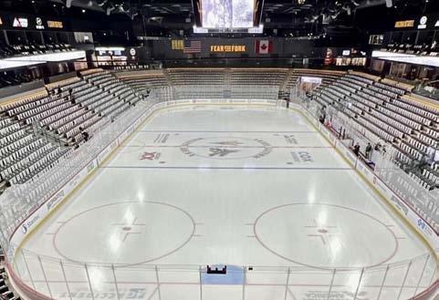 La cancha Rebel presenta el patrón degradado del uniforme a lo largo de las líneas de fondo y laterales, una pintura negra y el logotipo de PHX en la mitad de la cancha.