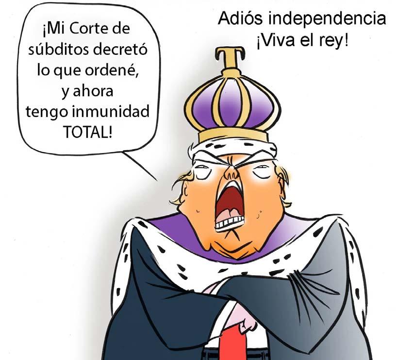 “Es realmente importante que comprendamos la verdadera razón por la cual esta elección es la más importante de la historia, no solo en nuestras vidas, sino en la historia de la era Trump. Una de las razones ocurrió hoy mismo: la Corte Suprema de los Estados Unidos básicamente dijo que el Presidente de los Estados Unidos puede cometer crímenes y salirse con la suya.