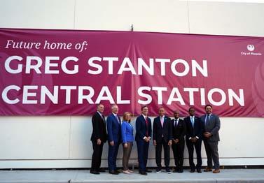 La alcaldesa Kate Gallego, junto con miembros del Consejo de la Ciudad de Phoenix, llevaron a cabo una ceremonia oficial para renombrar el principal centro de transporte del centro como la “Estación Central Greg Stanton”.