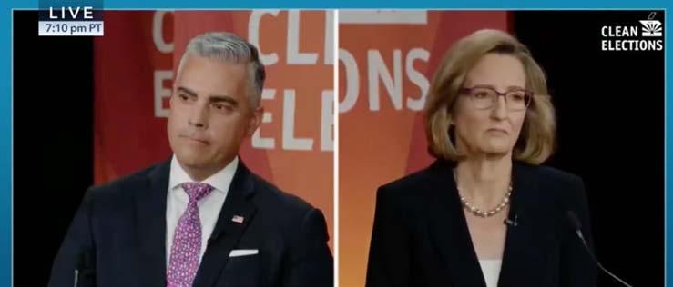 El enfrentamiento entre Juan Ciscomani y Kirsten Engel mostró las marcadas diferencias entre ambos candidatos en temas clave, como el aborto y la política migratoria, lo que deja en manos de los votantes la decisión final sobre quién representará el Distrito 6 de Arizona. SCREENSHOT: Arizona Clean Elections