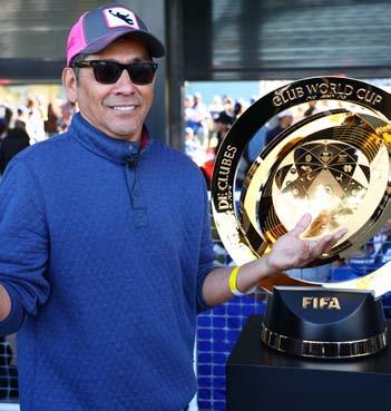 Jorge Campos, el popular ex guardameta mexicano, con el trofeo del Mundial de Clubes en Los Angeles. CORTESIA: FIFA / Joe Scarnici