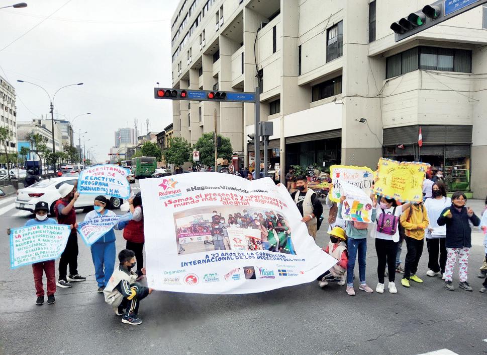 Joselim, Sofía, Jeremy, y otros más recorrieron la avenida Abancay hasta llegar al fron tis del Congreso de la Repú blica, donde con banderolas y pancartas pidiendo que le yes que protejan su derecho a la educación, salud, trabajo digno, ejerciendo su ciudada nía con el acompañamiento de colaboradores compro metidos y proactivos.