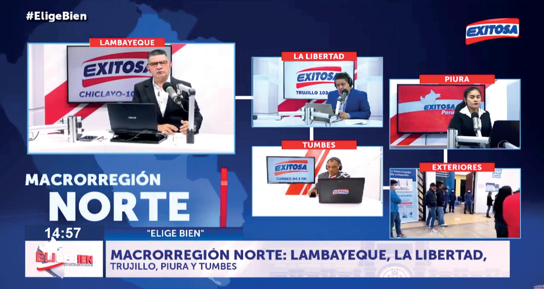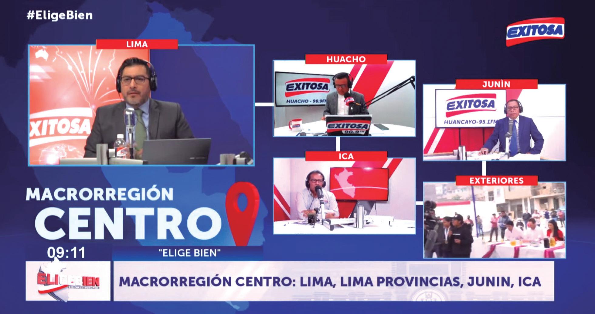 La plataforma de radio-TV Exitosa cumplió ayer un despliegue informativo de las Elecciones Regionales y Municipales 2022, donde por primera vez en la his toria de la televisión perua na la transmisión fue des centralizada, ya sea desde diversas regiones del país que enlazaban con los re