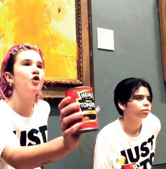 Londres. Activistas ecologistas arrojaron sopa de tomate a un cuadro de Van Gogh en un museo de Londres. Se trata del famoso cuadro Los Girasoles de Vincent van Gogh en la National Gallery de Londres, para exigir al gobierno del Reino Unido que ponga fin a los nuevos proyectos de extracción de gas y petróleo. Se trata de dos activistas del grupo de desobedien cia civil ‘Just Stop Oil’ que arrojaron dos latas de sopa de la marca Heinz sobre el lienzo del maes tro neerlandés.