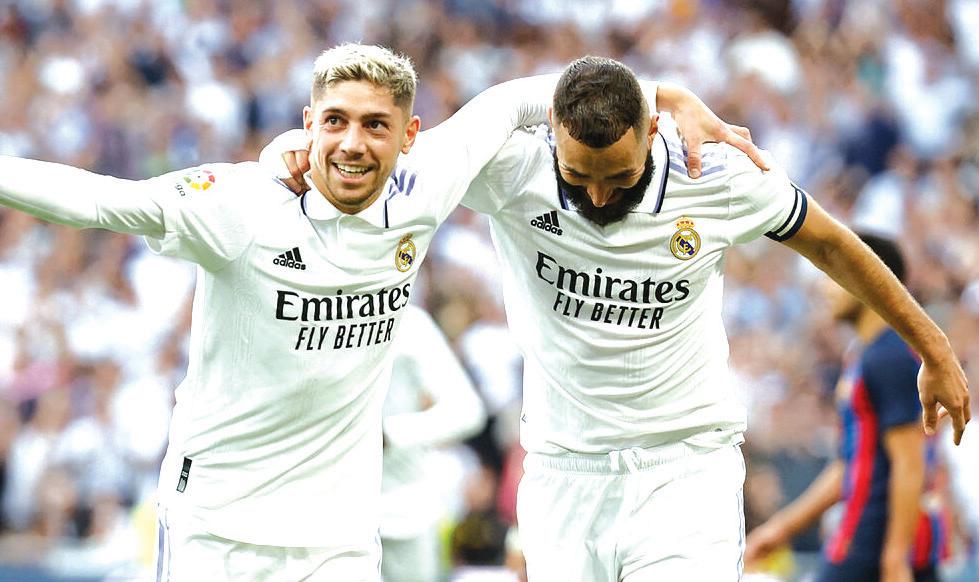El artillero francés abrió el marcador (12’) y el uru guayo Federico Valverde hizo el 2-0 (35’), antes de que Ferran Torres acortara distancias (83’) y Rodrygo hiciera el 3-1 de penal (90+1), lo que deja al Real Madrid líder en solitario de la LaLiga. Benzema, princi pal candidato del Balón de Oro, volvió a reencontrarse con el gol tras más de mes y medio sin marcar en un inicio de temporada en medio de lesiones.