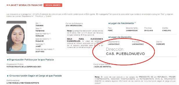 tarse como candidata por el partido Frente de La Es peranza, en su hoja de vida dijo domiciliar en el caserío ‘Pueblo Nuevo’ del distrito de Mórrope. Esto llamó la atención de algunos mo radores morropanos, quie nes afirmaron no conocer a esta joven postulante. So bre todo, del abogado José Zeña, quien le envió una carta notarial indicándole que explique dónde do miciliaba exactamente ya que, según la ficha Reniec de Morales, ella es nacida en Chiclayo y domiciliada en el caserío Valle Nuevo en Mochumí y no ‘Pueblo Nuevo’ en Mórrope; inclu so, afirma que el caserío Pueblo Nuevo no existe, controversia que, según el