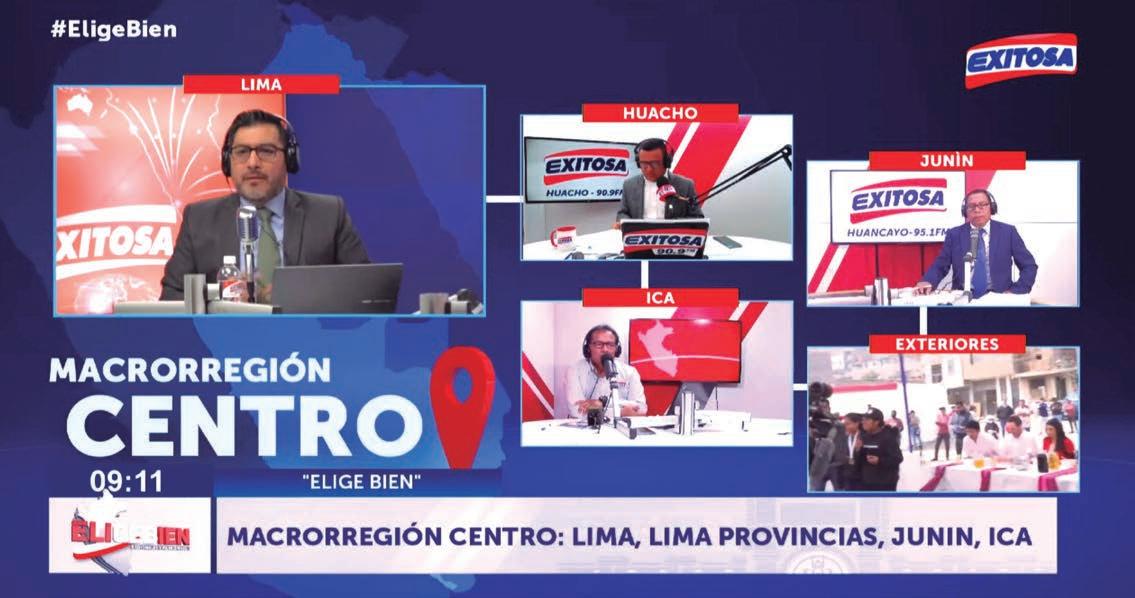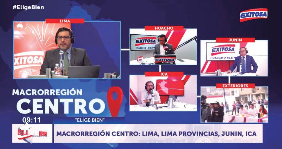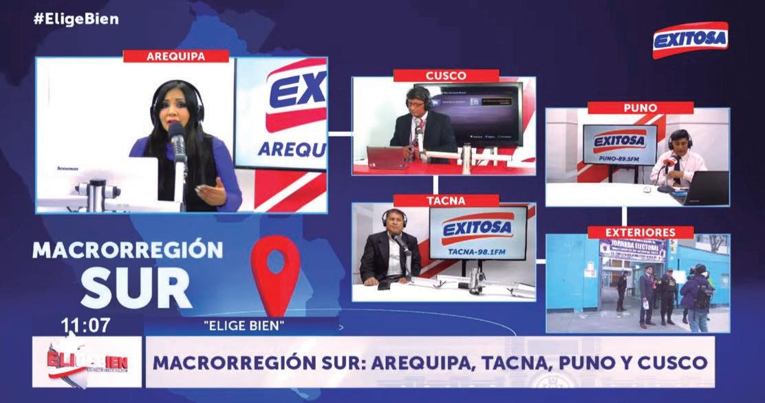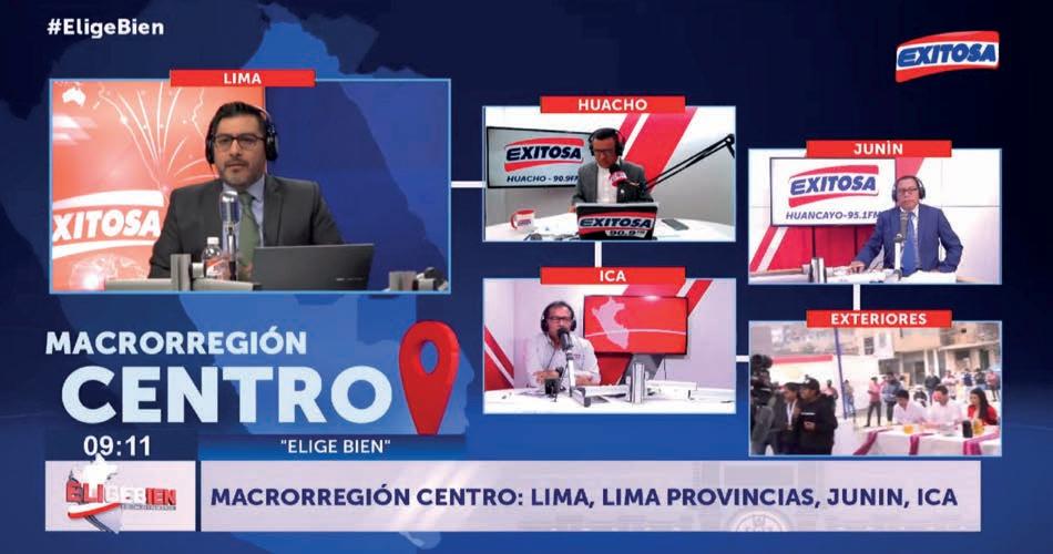 La plataforma de radio-TV Exitosa cumplió ayer un despliegue informativo de las Elecciones Regionales y Municipales 2022, donde por primera vez en la his toria de la televisión perua na la transmisión fue des centralizada, ya sea desde diversas regiones del país que enlazaban con los re