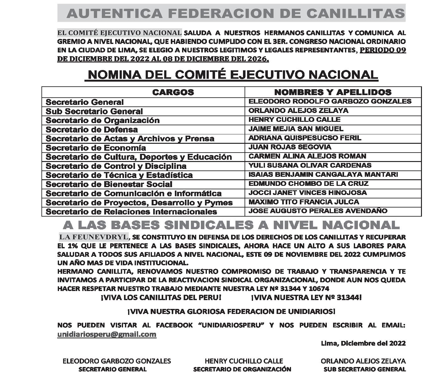 LA FEUNEVDRYL, en esta fecha tan especial saluda a todos nuestros hermanos Canillitas a nivel nacional. El Congreso de la República Declaró el 05 de Octubre como el “Día del Expendedor de Diarios, Revistas y Loterías - CANILLITA”, mediante la Ley No 30677. Esta norma reconoce el importante rol social que cumplen estos trabajadores dentro de la comunidad, al posibilitar que la información publicada esté al alcance de loslectores, garantizando de esta forma el derecho a la libertad de expresión y de información a la Poco a poco fuimos logrando un espacio público estable en la ciudad, fuimoscolocando periódicos y revistas. Ampliando posteriormente a la venta de libros, golosinas y otros artículos complementarios. No solo damos información a la ciudadanía, también fomentamos la lectura, cultura y orientación turística. POR DESCONOCIMIENTO algunos gobiernos municipales hostilizan nuestro trabajo en la vía pública y nos quieren considerar como parte del comercio ambulatorio, olvidándose que nuestro o cio de CANILLITAS es garantizar la libertad de información y expresión que está consagrado en la Constitución Política del Perú; AHORA, LA LEY N° 31344, “RECONOCE LA LABOR DE LOS CANILLITAS Y REGULA SUS ACTIVIDADES EN LOS ESPACIOS PÚBLICOS”, y considera alcanillita como parte de un sistema de comunicación social y difusión cultural y sienta bases legales, laborales, comerciales y gremiales para una estrategia de formalización y modernización del sector. SALUDAMOS Y FELICITAMOS A LOS ALCALDES PROVINCIALES, DISTRITALES Y AUTORIDADES REGIONALES, ELEGIDOS DEMOCRATICAMENTE. UNIDIARIOS, hace un alto en su labor diaria y reconocer a todos loscompañeros que fallecieron en cumplimiento de su labor y pedimos a Dios que los tenga en su gloria, a los compañeros que se encuentran enfermos pronta recuperación O cina principal: Jr. Guzman Blanco Nº136 - 2do piso - Lima Email: unidiariosperu@gmail.com Telf: (01) 733-6059 - cel:999630816 UNIDIARIOS PERU