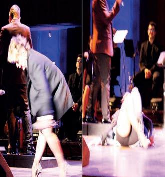 La cantante mexicana Alejandra Guzmán se cayó el martes durante su actuación en la gala de la Herencia His pana de Estados Unidos, celebrada en el Centro Kennedy de Washington, por lo que se canceló el evento, del que fue evacuada en ambulancia. Ella estaba interpretando la canción “Mala Hierba” cuando perdió el equilibrio, se cayó hacia atrás y quedó estirada en el escenario. Acto se guido, varios asistentes subieron al lugar para socorrerla y tras unos minutos, anunciaron el fin del evento sin que la artista llegara a ponerse en pie. Minutos después, una ambulancia con la cantante salió del Kennedy Center.❖