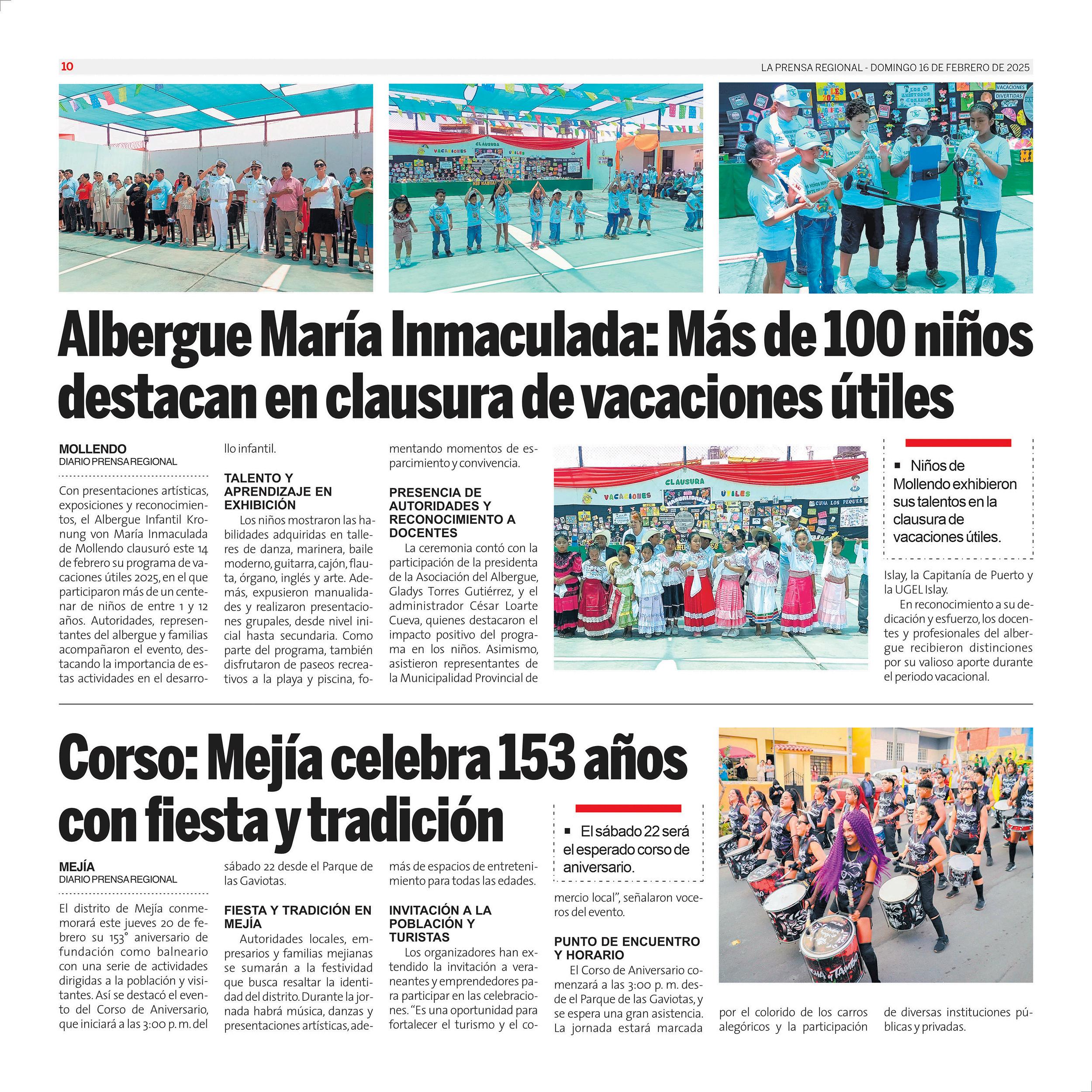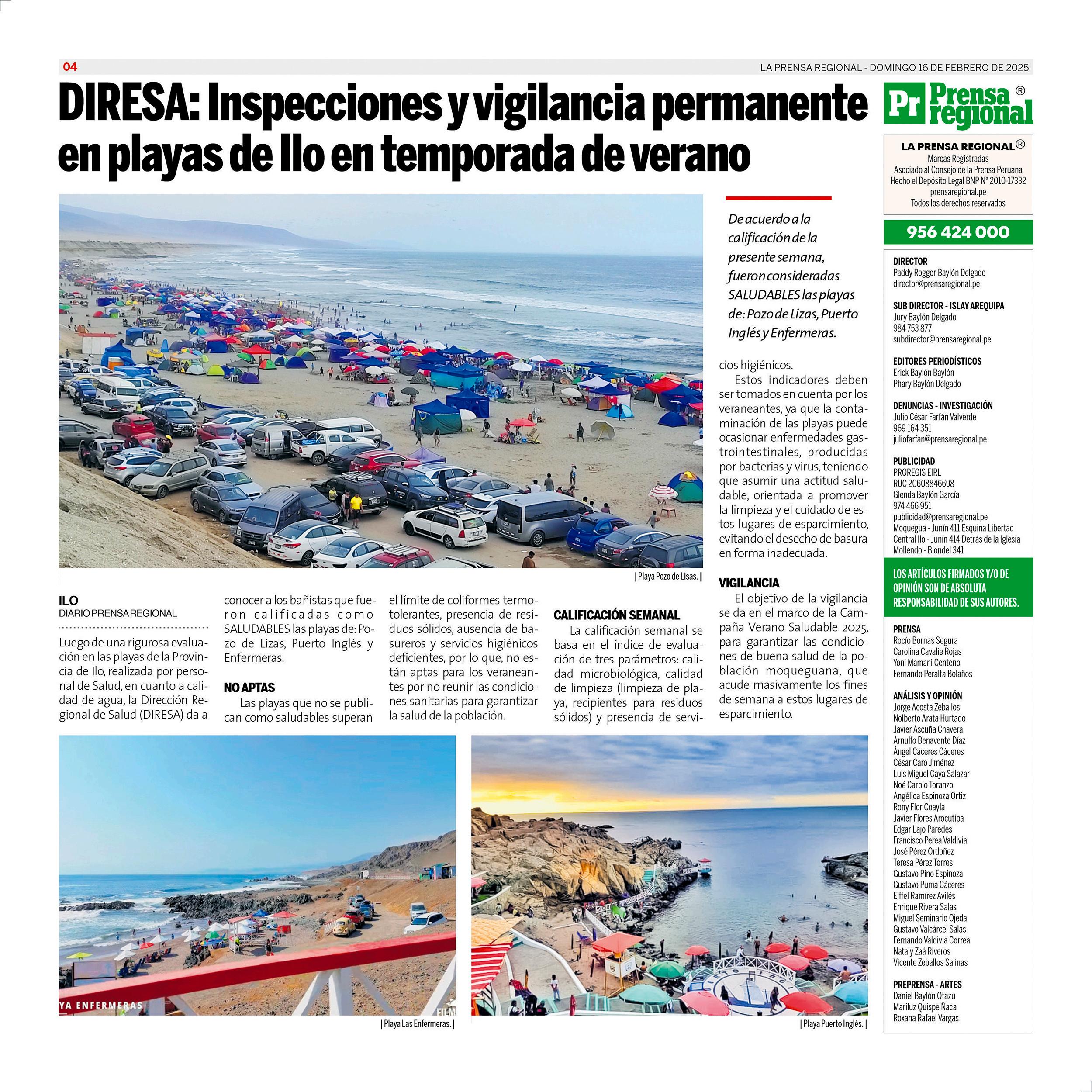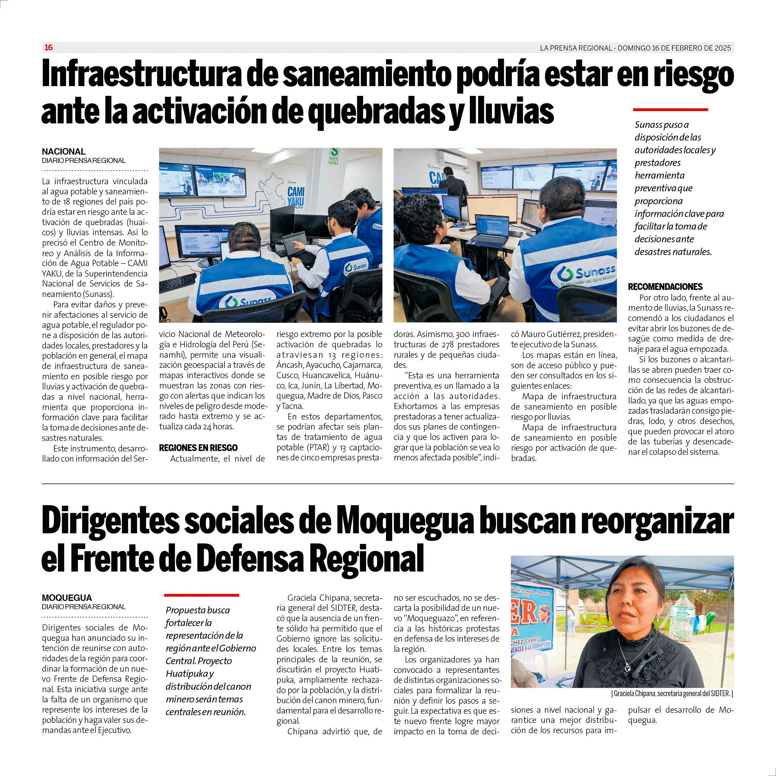 La Prensa Regional - Domingo 16 de febrero de 2025 - https://prensaregional.pe/ | Moquegua, Ilo, Pacocha, El Algarrobal, Samegua, Torata, Carumas. Omate. Ichuña. Islay, Matarani, Mollendo, Mejia, Cocachacra. San Antonio. Tia María, Alberto Huaracha Jorge UNAM, Sunass, IPE, Anibal Quiroga