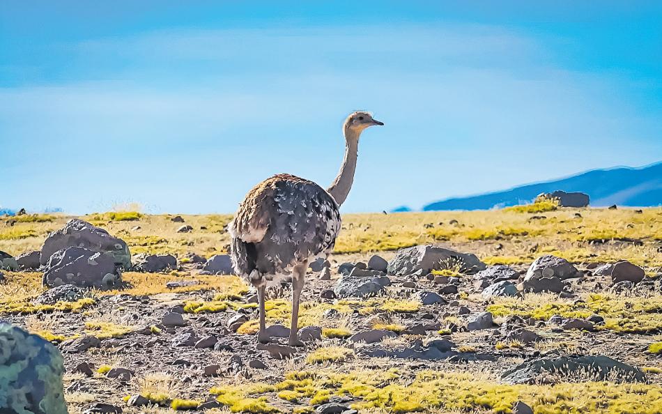 y cuello largos, adaptada a la vida en los Andes. Se distingue por su plumaje gris parduzcoconpuntasblancasysu notable velocidad al correr. Considerada la mayor ave no voladora del país, puede alcanzar entre 93 y 155 centímetros de altura, es herbívora y llega a correr hasta 60 kilómetros por hora, además de poseer un agudo sentido del oído.