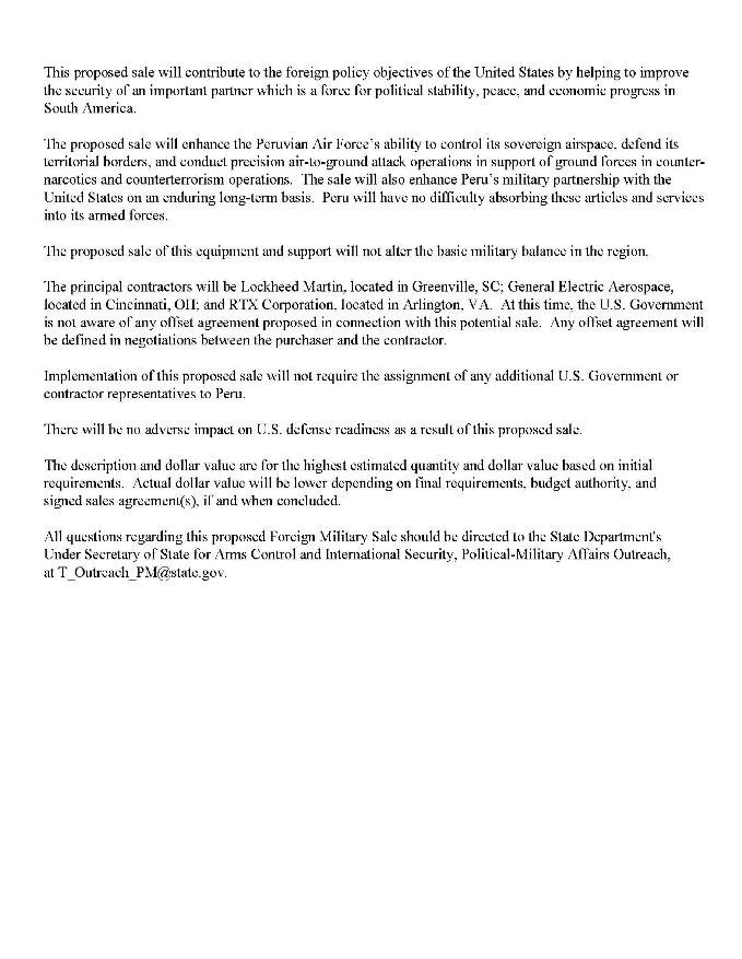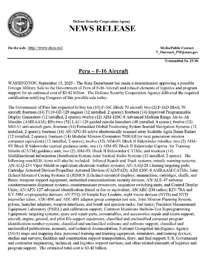 “El Departamento de Estado ha decidido aprobar una posible Venta Militar ExtranjeraalGobiernodelPerúdeaeronavesF-16yelementosrelacionados de logística y apoyo alprograma,poruncostoestimadode3420millonesdedólares. La Agencia de Cooperación para la Seguridad de la Defensa emitió la certificación requerida para notificar