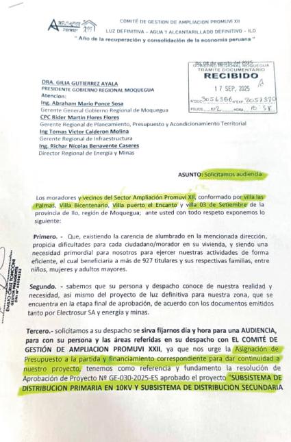 A través de un documento dirigido a las principales gerencias del Gobierno Regional, el Comité de Gestión de Ampliación Promuvi XII recordó que el proyecto ya cuenta condictamenfavorabledefactibilidad aprobado por Electrosur S.A. y el visto bueno de la Dirección Regional de EnergíayMinas.