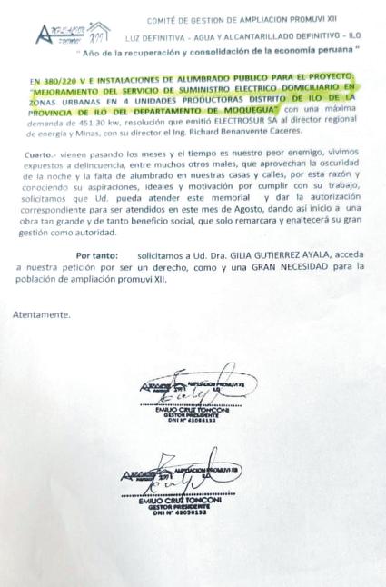 Casi mil familias del sector Ampliación Promuvi XII de Ilo piden a la gobernadora regionaldeMoquegua,GiliaGutiérrez Ayala, la asignación del presupuesto necesario para ejecutarelproyectodeelectrificación que beneficiará a los vecinosdeVillaLasPalmas,Villa Bicentenario,Villa Puerto El Encanto y Villa 03 de Setiembre.