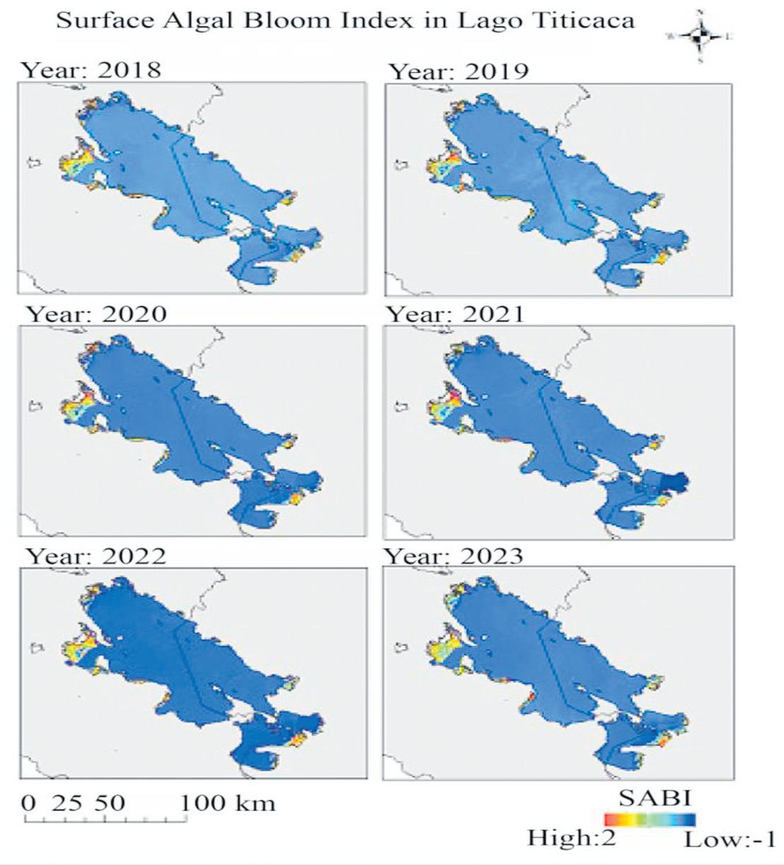 El artículo, titulado "Study ofHarmfulAlgalBloomsinLake Titicaca from 2018 to 2023 based on Landsat 8 Satellite", liderado por Natalia I. VargasCuentas(autoraprincipal),demuestra, mediante el análisis de índices espectrales como NDVI, CI-Green, SABI y CVI, quelaszonasafectadasporalgas en el lago han crecido significativamente en los últimos años, alcanzando en 2023 entre 510.1 km² y 604.2 km² —lo que representa hastael7.05%deláreatotaldellago.