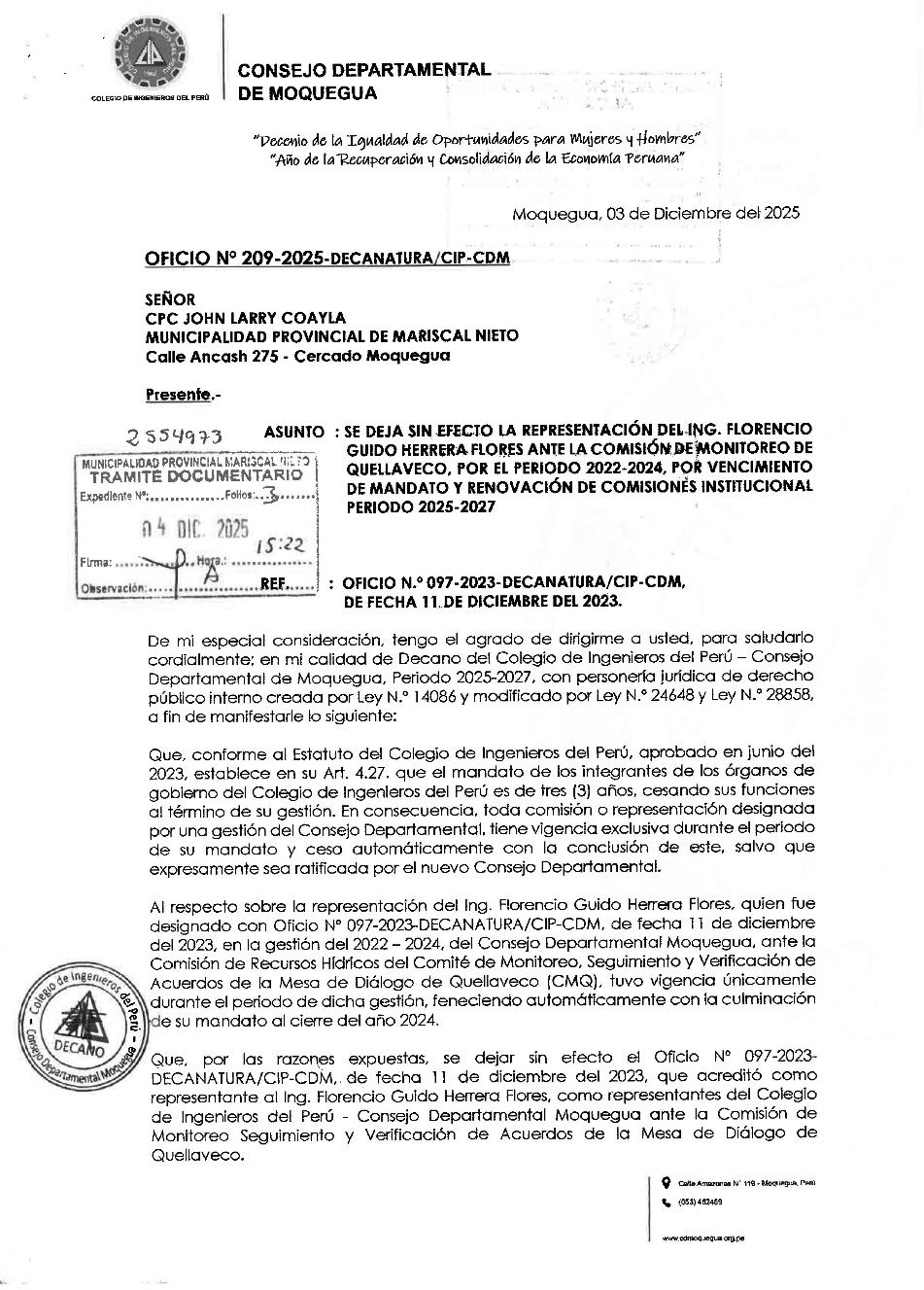 El punto de quiebre se encuentra en el Oficio N.° 2092025-DECANATURA/CIPCDM, emitido el 3 de diciembre de 2025 por el Colegio de Ingenieros del Perú – Consejo Departamental Moquegua, mediante el cual se deja sin efectolarepresentacióndelingeniero Florencio Guido HerreraantelaCMQ.