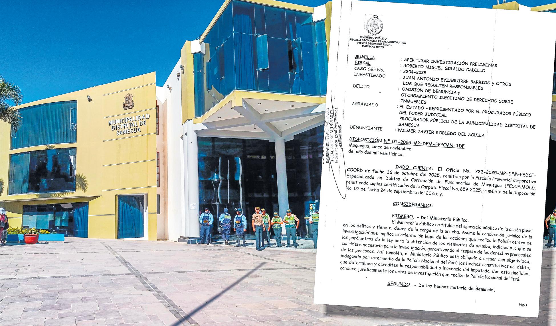 El Ministerio Público ha abierto una investigación preliminarcontraelalcaldedelaMunicipalidad Distrital de Samegua, Juan Antonio Eyzaguirre Barrios, y los miembros del concejo municipal, así como elprocuradorpúblicodelaen-