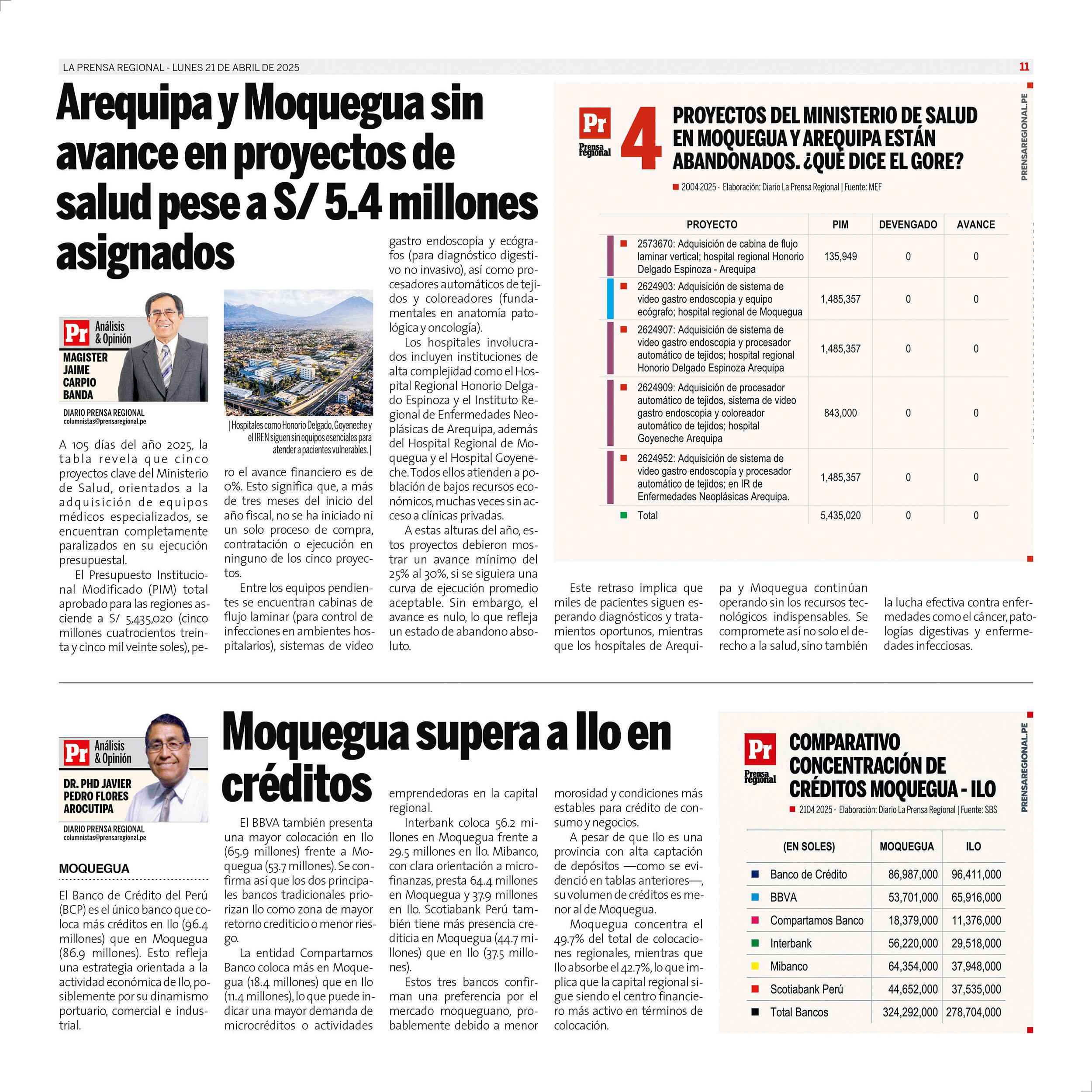 La Prensa Regional - Lunes 21 de abril de 2025 https://prensaregional.pe/ #Moquegua, #Ilo, Pacocha, El Algarrobal, Samegua, Torata, Carumas. Omate. #Ichuña. #Islay, Matarani, #Mollendo, Mejia, Cocachacra. #Arequipa, Julio Failoc Rivas. INEI. Vicente Antonio Zeballos Salinas, Jorge Acosta Zevallos, Javier Flores Arocutipa, César Caro Jiménez, Fernando Valdivia Correa, Gustavo Puma Cáceres Luis Miguel Caya Salazar. Rodrigo Llosa Sanz.