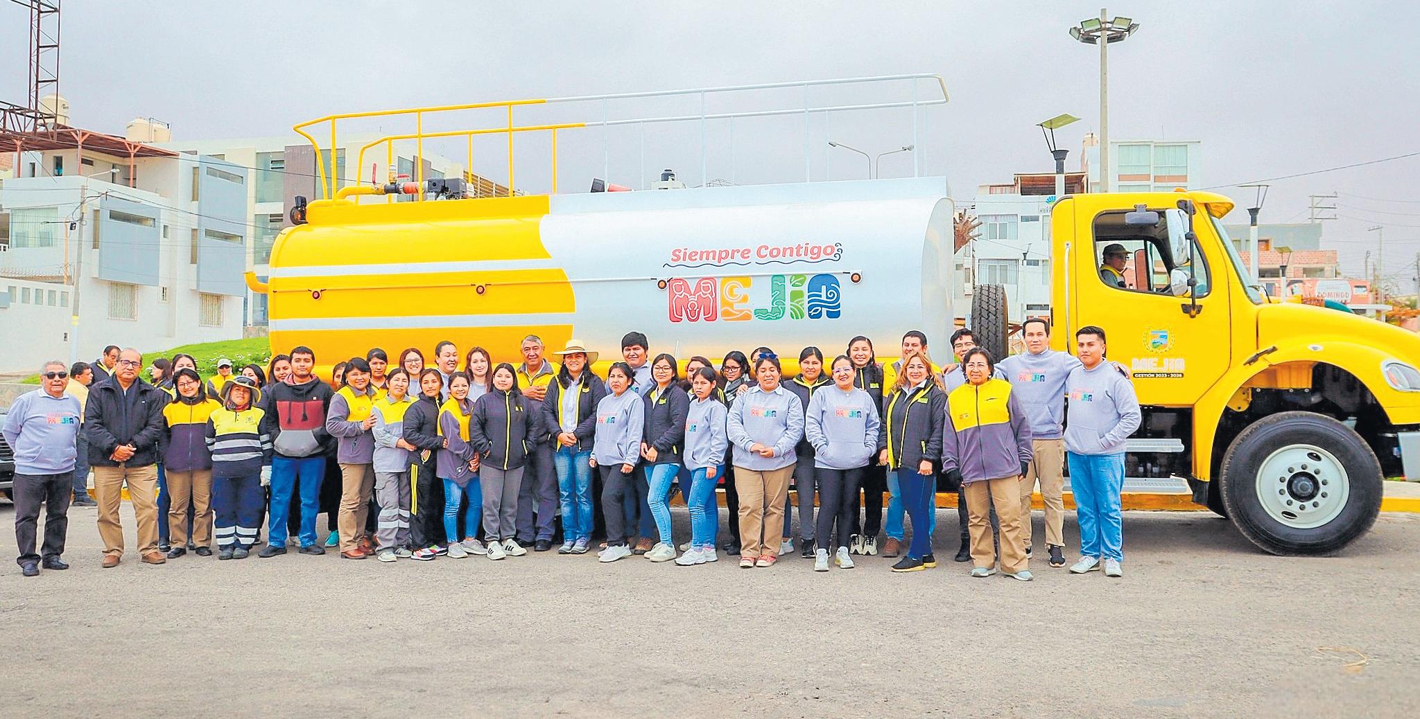 | La alcaldesa de Mejía junto a vecinos presenta un nuevo camión cisterna,en un distrito que apenas alcanza el 41.9% de ejecución presupuestal,ubicándose en el último lugar de la provincia. |