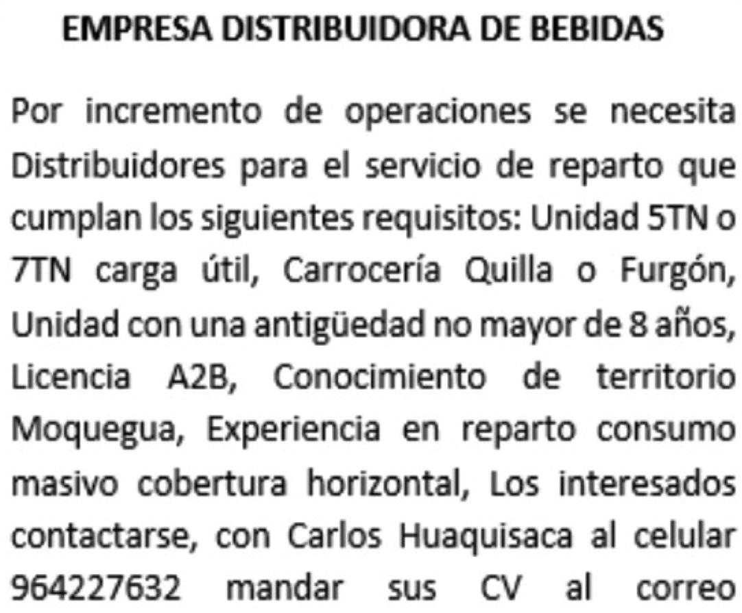 RUTA SUR S.A.C. (DISTRIBUIDOR COCA-COLA) SOLICITA CONDUCTORESAIIICYAYUDANTES DE REPARTO PARA MOQUEGUA. OFRECEMOS INGRESOAPLANILLA, SUELDOS FIJOS MAS COMISIONES Y TARJETA DE ALIMENTOS. UBICADOS EN AV.LA PAZ 1205 A ESPALDAS DEL TERMINAL. COMUNICARSEAL919083604. 07D/15-31/OCT