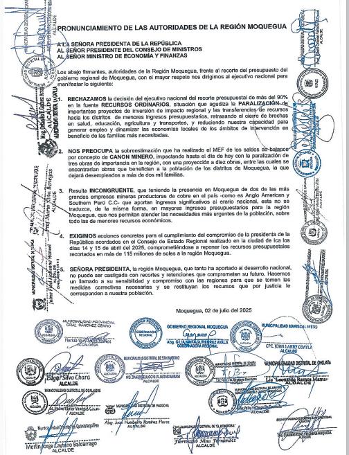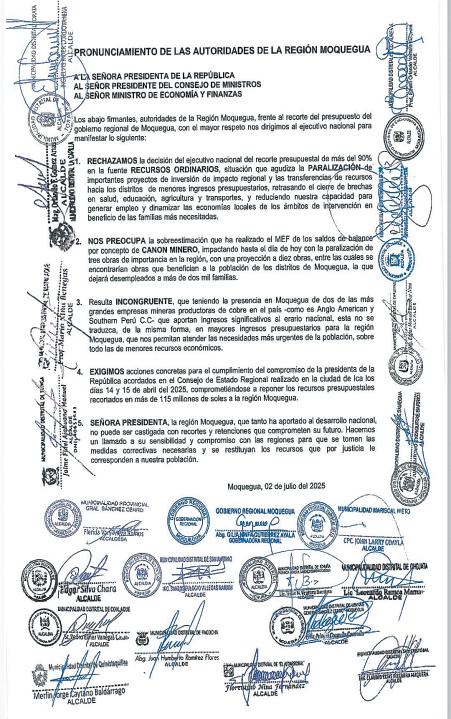 ENVIANMEMORIALADINABOLUARTE Autoridades de Moquegua exigen restitución de más de S/ 115 millones