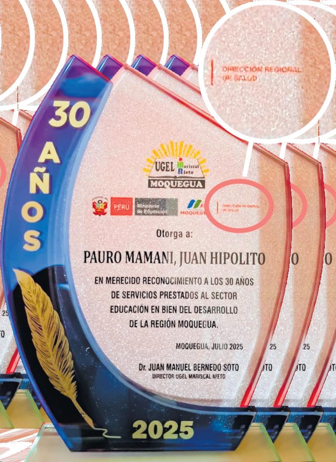 En las estatuillas o vidrios que se entregaron a los maestros por sus25o30añosdeservicio,enlosqueentrególaUGELMariscal Nieto decía: "Dirección Regional de Salud" bajo la dirección del profesor Manuel Bernedo Soto. Tremendo error en la elaboracióndeesosrecuerdos.Alguienpreguntóporallí:¿noestarádirigiendoesainstituciónelChavodel8?