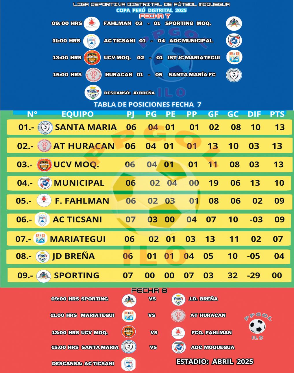 El Club Deportivo Moquegua perdió de local ante Santos de Nazcapor0-1enlaLiga2.Enellancejugadoenelestadio“25de Noviembre”, a los moqueguanos les faltó creación y definición. Yavandospartidosysolotienenunpunto… Congratulaciones para CarloTapia Zárate,juvenil moqueguano que logró la medalla de oro en la III Competencia Internacional de Ciclismo Rally MTB,Rutas por el Valle de Locumba 2025,con motivodel37.ºaniversariodelaprovinciaJorgeBasadre… Estelunes14deabril,elConsejoRegionalsesionó,llevandoelvisto bueno para transferir S/ 4 millones 277 mil soles para la obra Mejoramiento del Servicio deTransitabilidadVehicular y Peatonal de la calle Cultural Lindaypampa Sabaya de Omate.Será en dos partes: la primera de S/ 2 millones y la segunda con el resto…