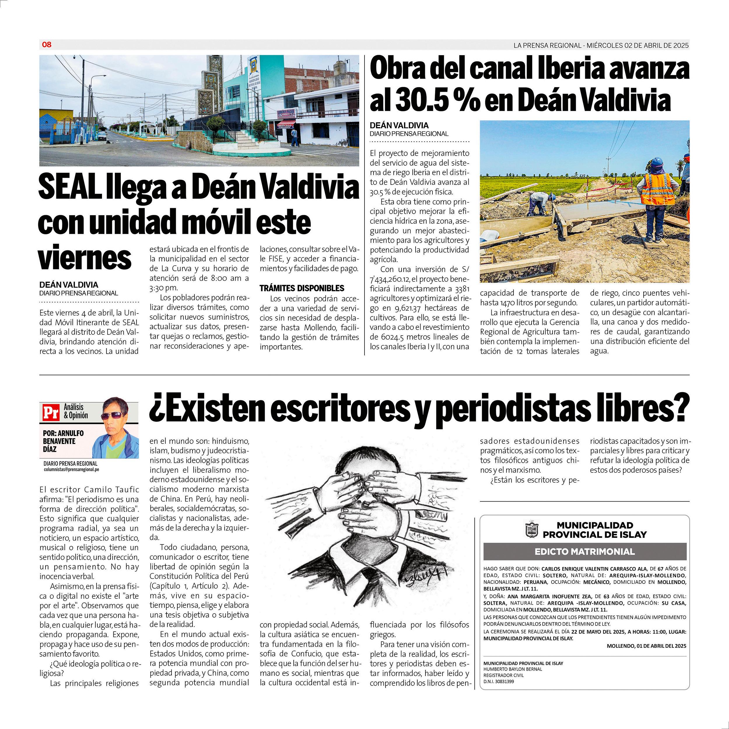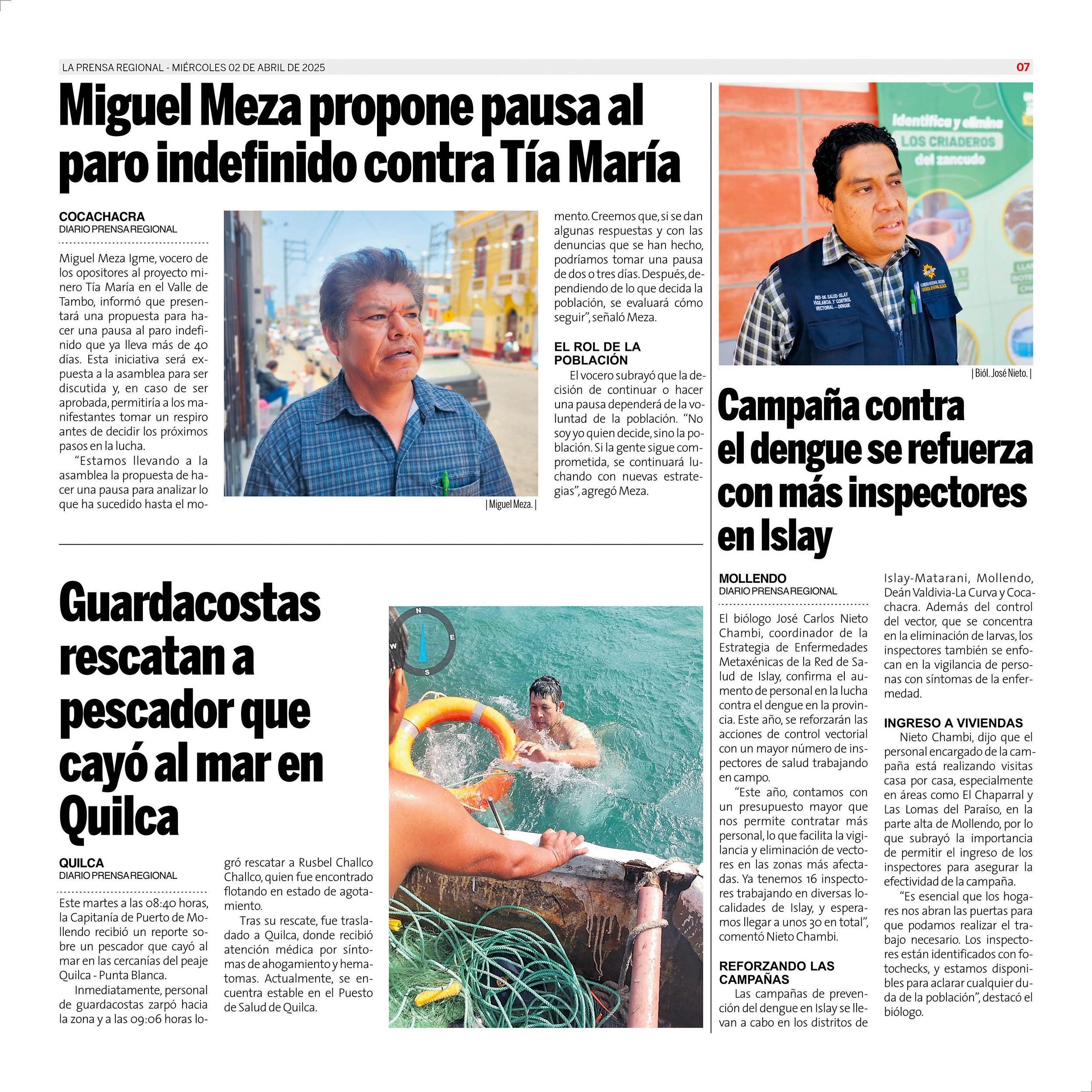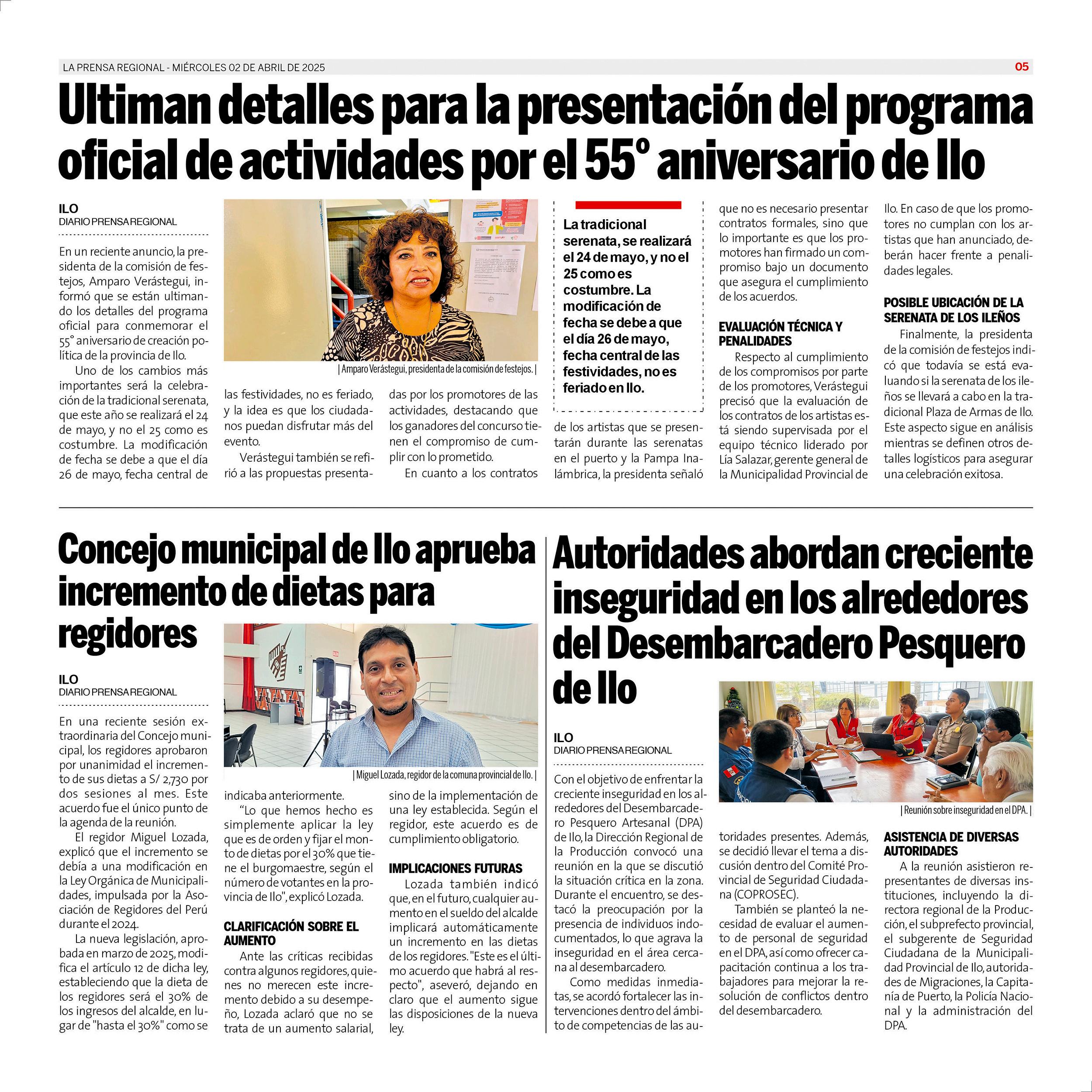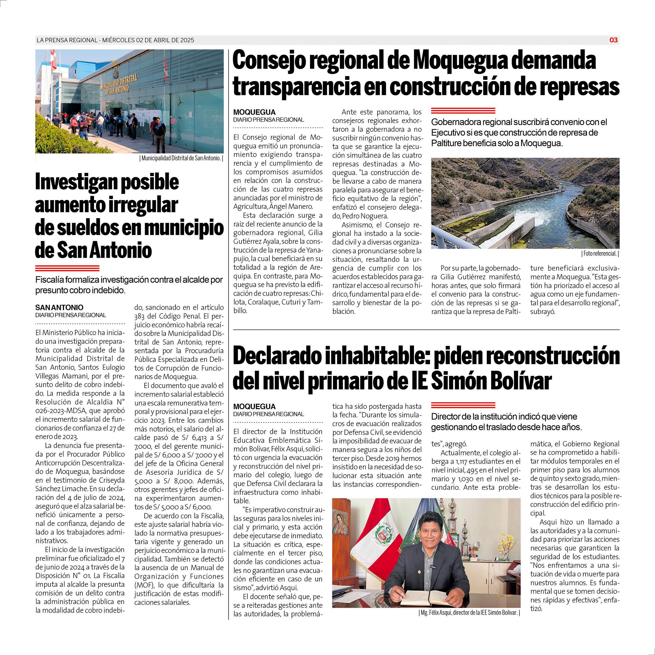 La Prensa Regional - Miércoles 02 de abril de 2025 https://prensaregional.pe/ #Moquegua, #Ilo, Pacocha, El Algarrobal, Samegua, Torata, Carumas. Omate. #Ichuña. #Islay, Matarani, #Mollendo, Mejia, Cocachacra. #Arequipa, Miguel Meza Idme, Santos Villegas Mamaní, Antonio Parisaca.