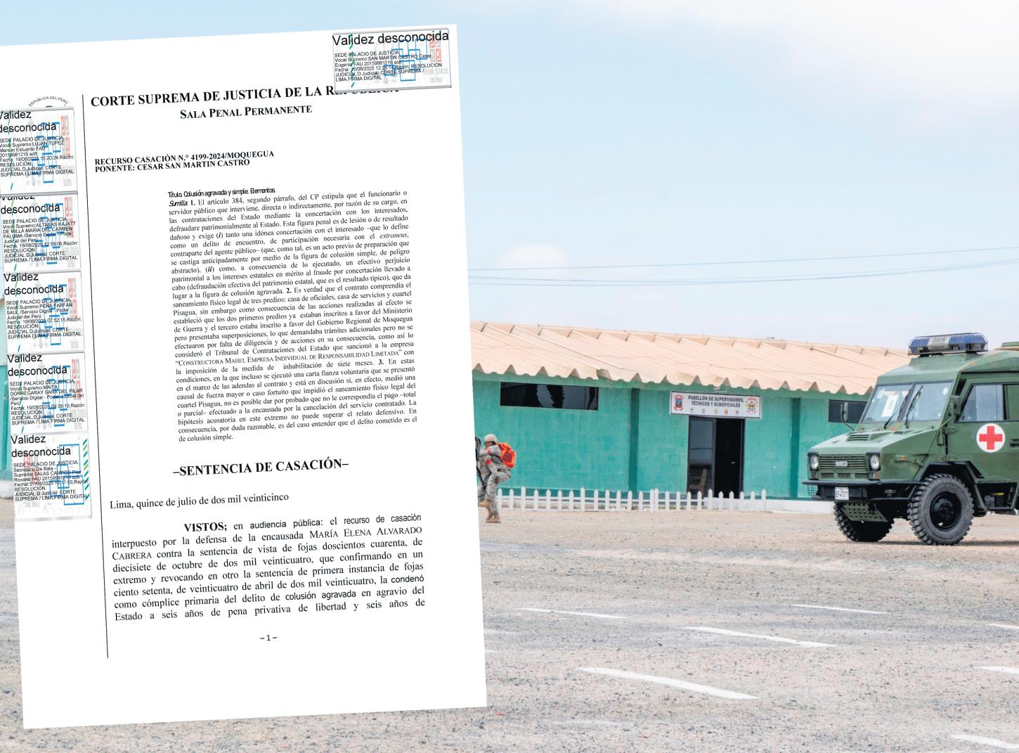 En2012,elEjércitoPeruano convocó un proceso de selección para el saneamiento físico-legal de tres predios en Ilo. La buena pro fue otorgada a la Constructora Mahel E.I.R.L., creadapocosmesesantespor M. E. Alvarado C., pese a no contar con experiencia en la materia. Durante la ejecución contractual se presentaron irregularidades como, por ejemplo, actas de constatación simuladas, firmas falsificadas y pagos adelantados sin que se acreditara el cumplimientototaldelservicio. Enprimerainstancia,eljuzgado condenó a la acusada por colusión simple, con 4 años de prisión suspendida. LaSaladeApelacionesdeMoquegua,encambio,elevólaca-