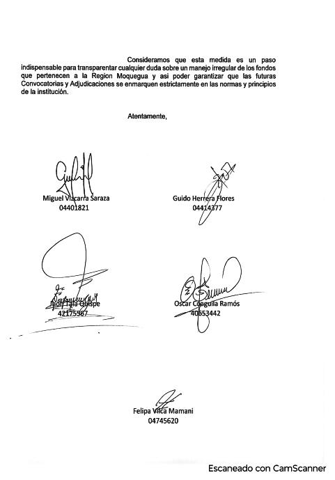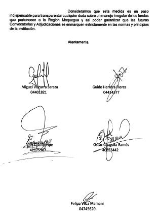 Cinco representantes por la Sociedad Civil ante el Comité deMonitoreoQuellavecosolicitaron la inmediata suspensión de los procesos de contratación del Fondo de Desarrollo Moquegua (FDM) hasta la elección e instalación del nuevoConsejoDirectivo.