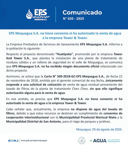 No obstante, esta última afirmación quedó desmentidaoficialmenteporlaEPSMoquegua mediante un comu-