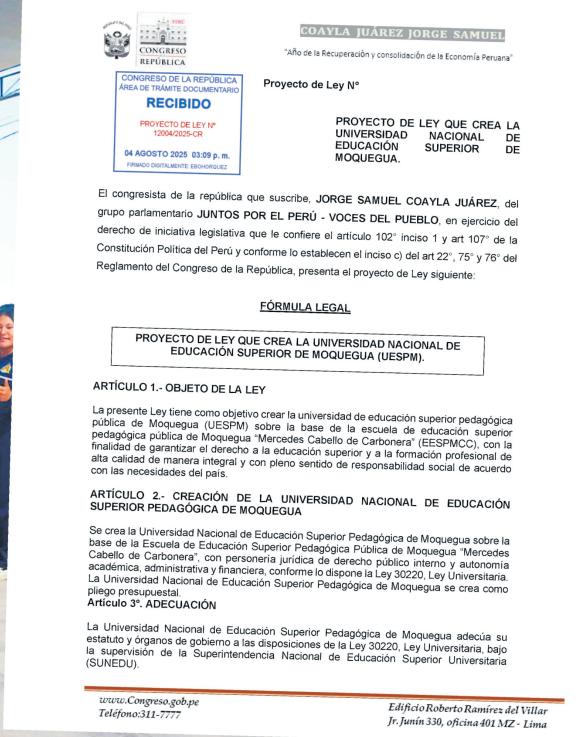 Una nueva propuesta legislativa busca fortalecer la educación superior en Moquegua. El congresista Jorge Samuel Coayla presentó el Proyecto de Ley N.° 12004/2025-CR, que plantea la creación de la Universidad Nacional de Educación Superior Pedagógica Pública de Moquegua (UESPM), con el objetivo de ampliar el acceso a una formación docente de calidad y responder a las necesidades educativasdelaregión.