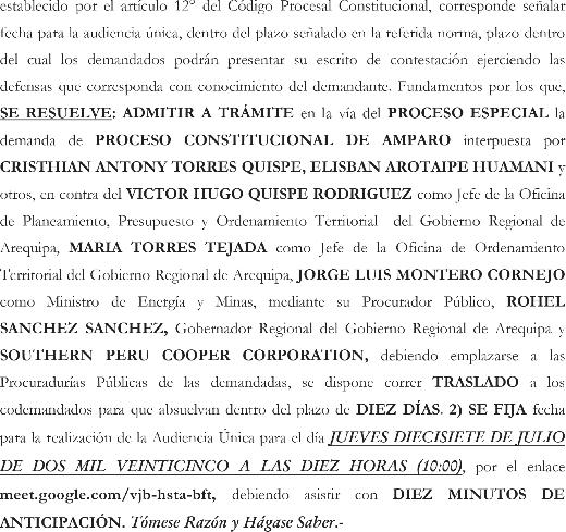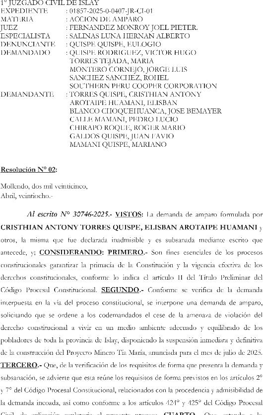 El amparo fue interpuesto por el denunciante Eulogio Quispe Quipe contra Southern Perú y funcionarios del Gobierno Regional de Arequipa, incluido el gobernador RohelSánchez,asícomoelministrodeEnergíayMinas.