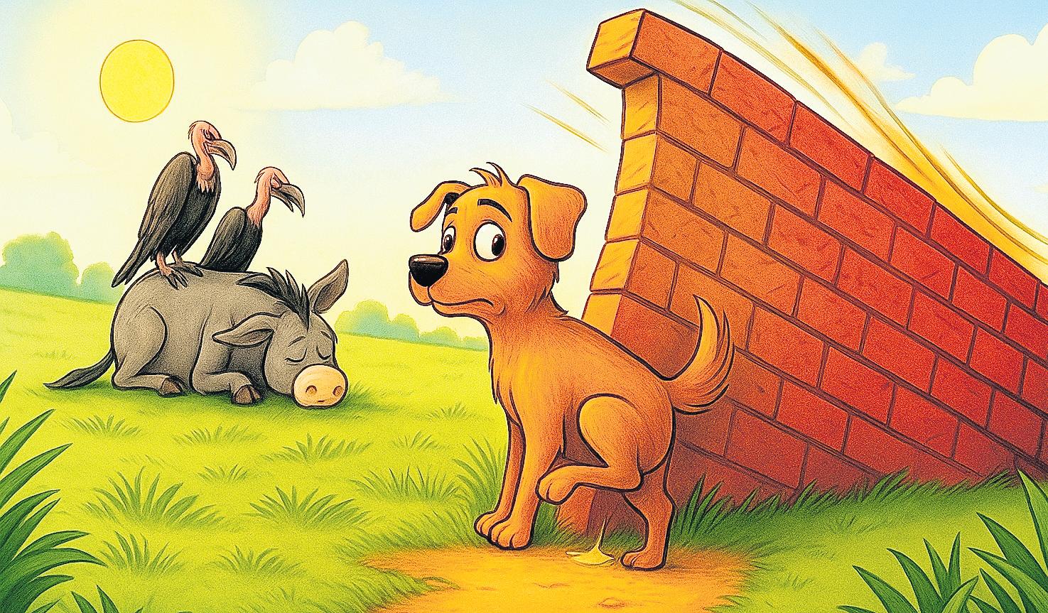 | Mientras el perrito marca territorio con confianza,la pared amenaza con marcarlo a él...y al fondo,los gallinazos se preparan para un banquete equivocado.¡Pero el burro solo duerme! |
