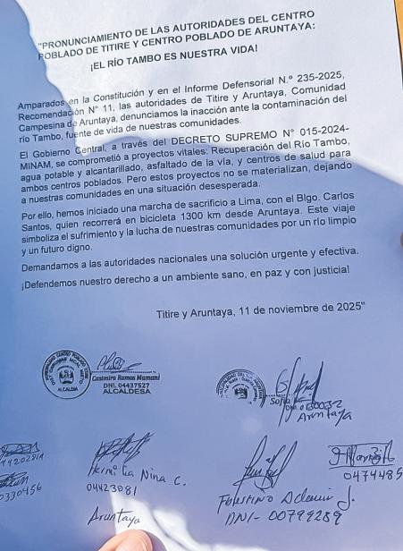 Eldocumento,firmadoel11 de noviembre de 2025 por autoridades locales y representantes comunales, advierte que, pese a los anuncios oficiales, los proyectos comprometidos —como la recuperacióndelríoTambo,ladotación de agua potable y alcantarillado,el asfaltado de la vía y la construccióndecentrosdesalud— no se han concretado. Esta situación mantiene a la poblaciónenunestadode“de-