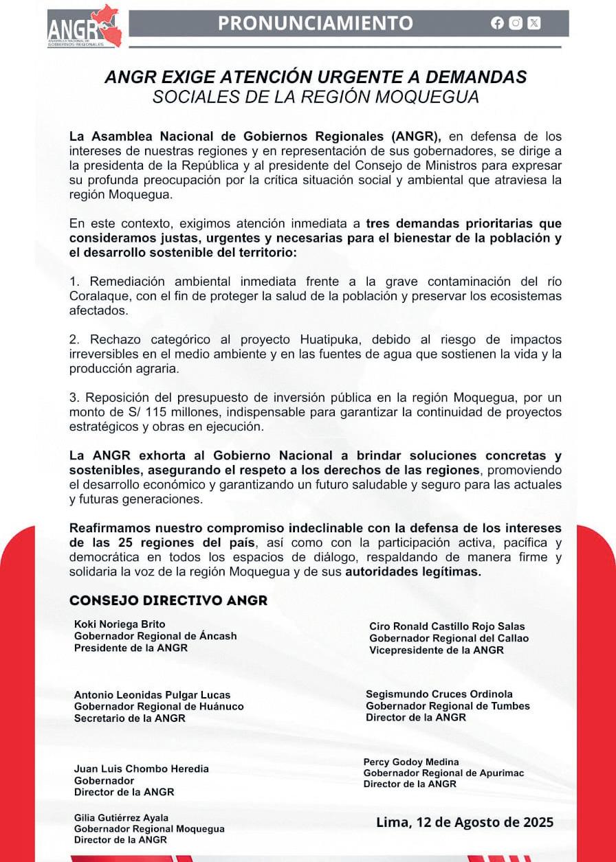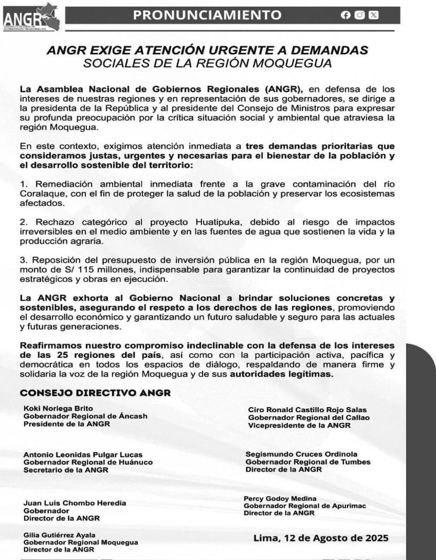 Siete gobernadores, miembros de la Asamblea Nacional de Gobiernos Regionales (ANGR), incluida la gobernadora de Moquegua, expresaronsurespaldoalaregiónMoquegua en sus demandas frente a la grave contaminación del río Coralaque y su rechazoalproyectoHuatipuka.