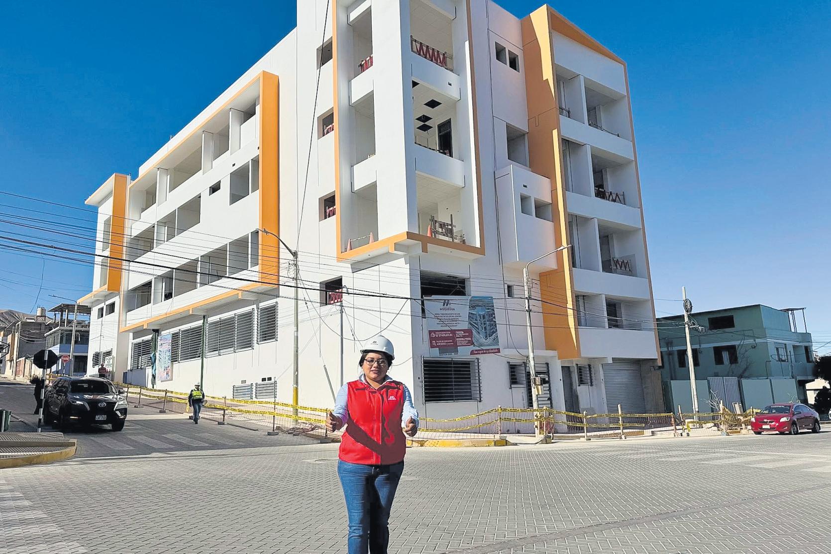 | La gobernadora Gilia Gutiérrez posa junto a la obra del centro de salud de Samegua, cuya ejecución arrastra sobrecostos,retrasos y fallas estructurales detectadas por la Contraloría. |