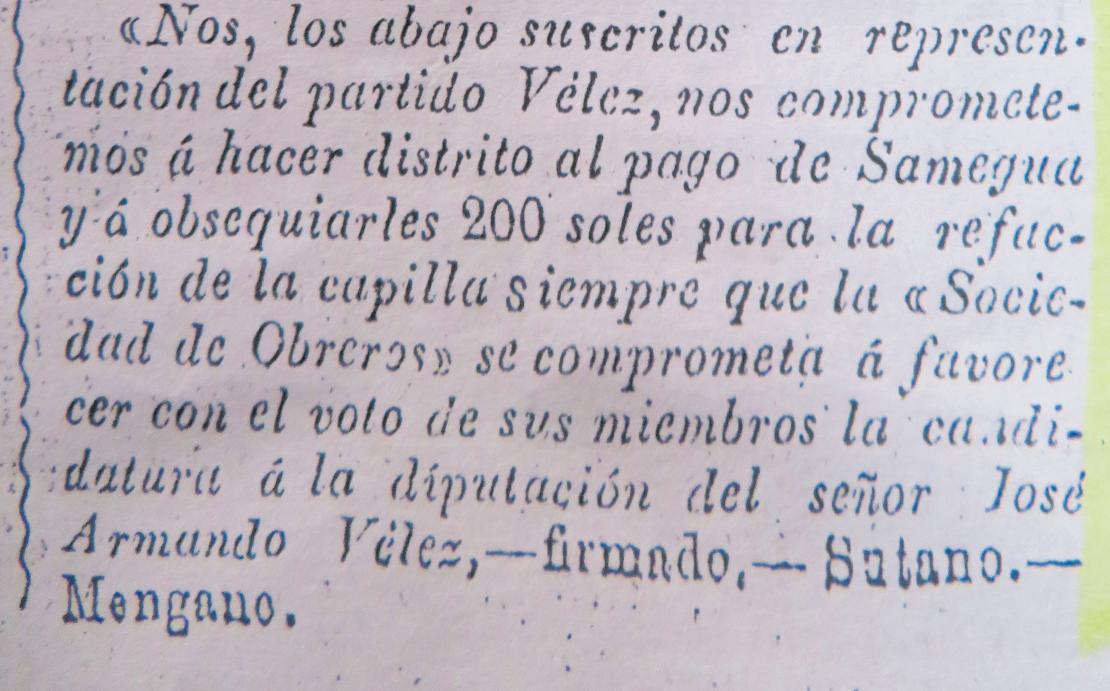 radoilegal.Elloexplicaque,en la campaña electoral de 1897, el candidato a diputado José Armando Vélez asumiera como uno de sus compromisos electoraleshacerdistritoalpagodeSamegua.