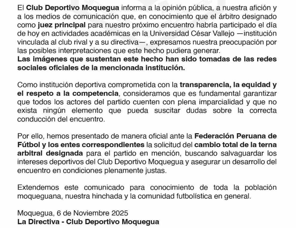 rar”, señalando la necesidad de “garantizar la transparenciaylaequidad”enunpartido decisivo. En ese mismo documento, la dirigencia informó haber presentado una solicitud formal de cambio total de la terna arbitral ante la FederaciónPeruanadeFútbol. Ante ello, la Comisión Nacional de Árbitros (CONAR) confirmó que el reclamo fue aceptado y que se procederá alcambiodelárbitroprincipal, decisiónquebuscaevitarcualquier duda sobre la imparcialidad en la conducción del encuentro.