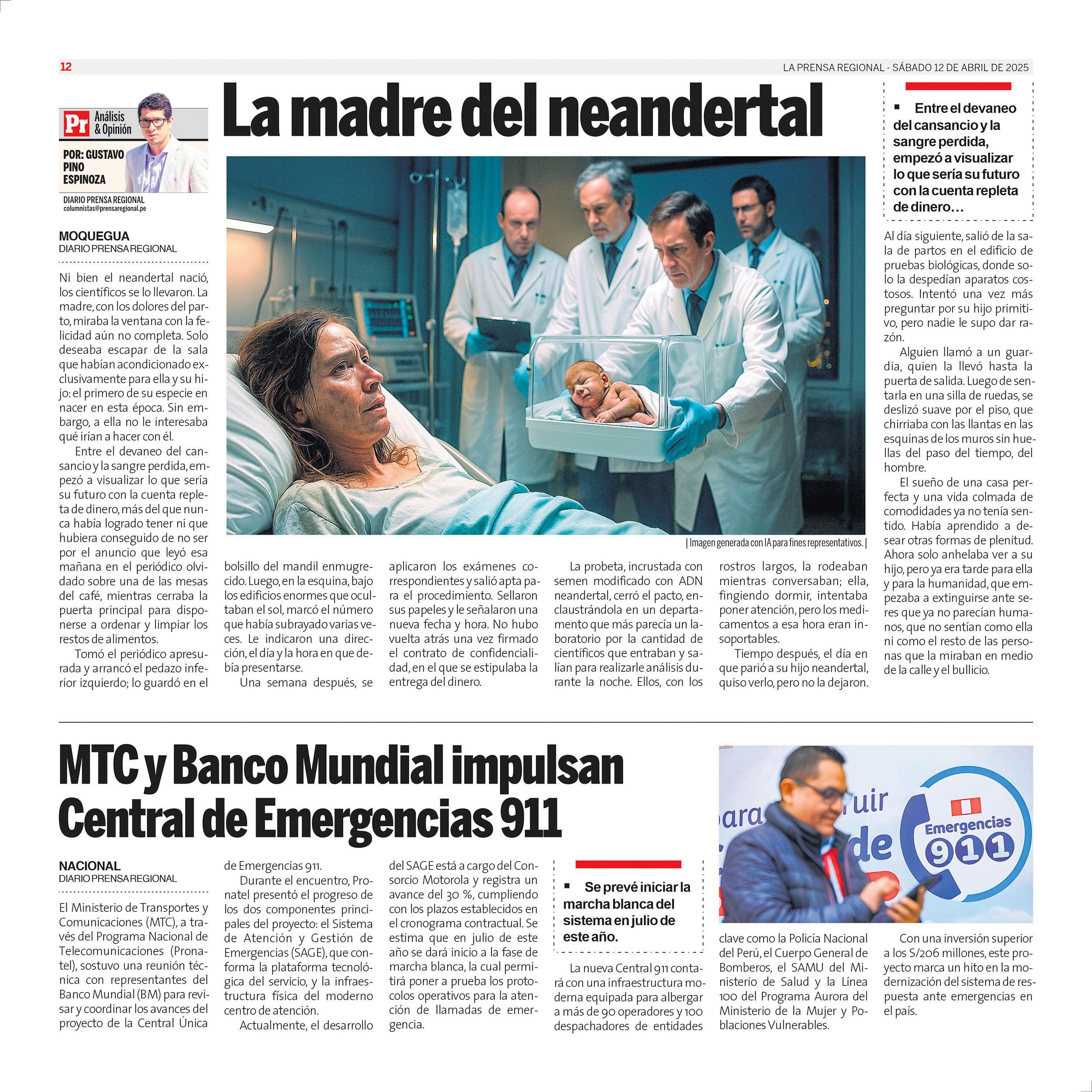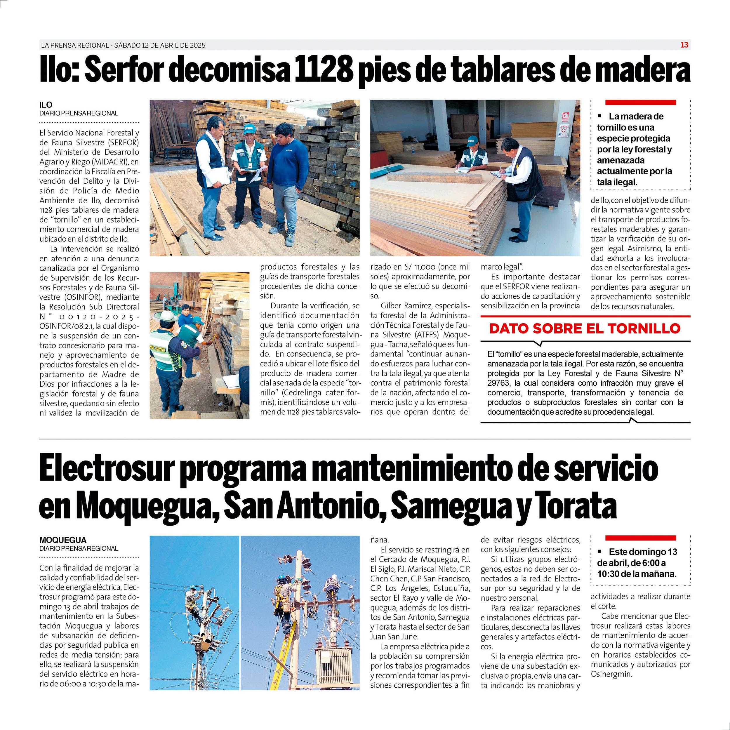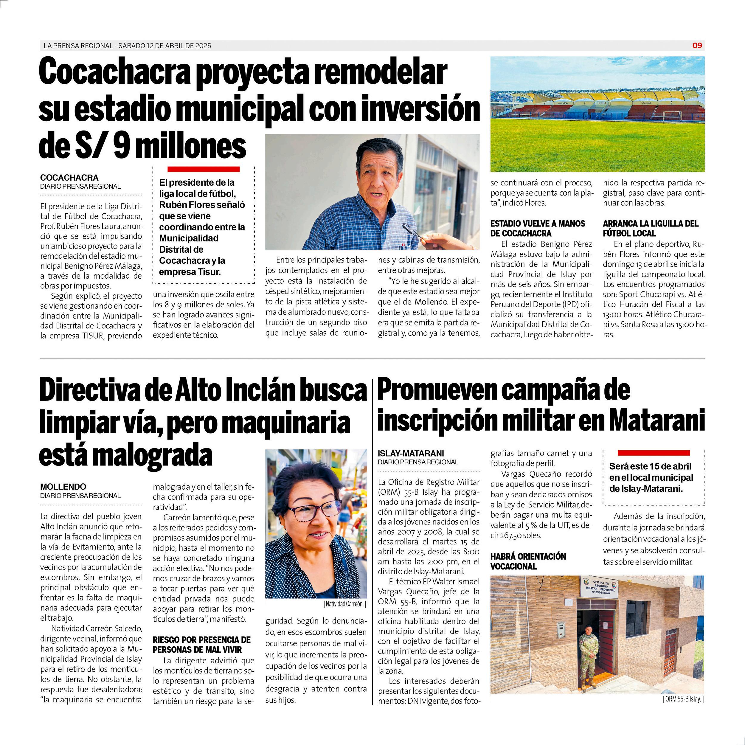 La Prensa Regional - Sábado 12 de abril de 2025 https://prensaregional.pe/ #Moquegua, #Ilo, Pacocha, El Algarrobal, Samegua, Torata, Carumas. Omate. #Ichuña. #Islay, Matarani, #Mollendo, Mejia, Cocachacra. #Arequipa, Julio Failoc Rivas, Katherine Maldonado Palomino, Gilia Gutiérrez Ayala, CMQ Quellaveco, Santuario Lagunas de Mejia,. Daniel Sánchez Alarcón EsSalud, Vendimia 2025,.Cusco.