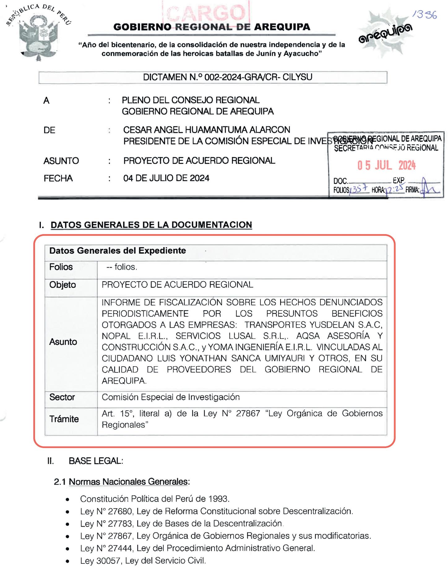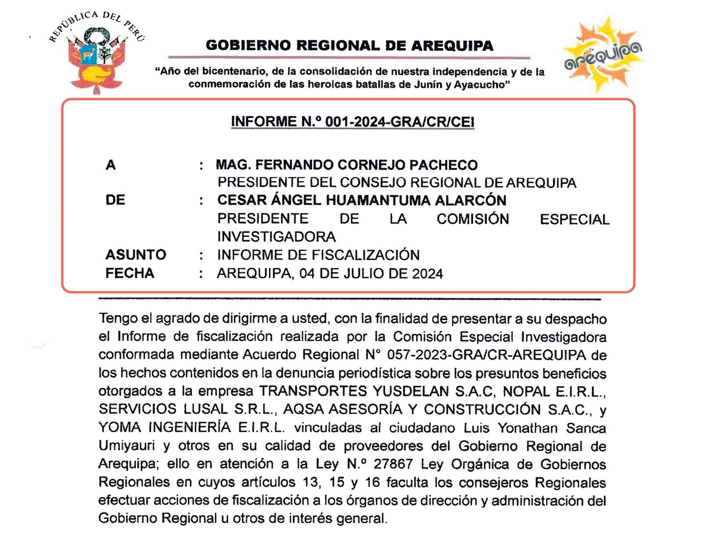 En contraposición, el Consejo Regional de Arequipa sí actuó con celeridad y responsabilidad:conformóunacomisión especial investigadora, presidida por el consejero regional Cesar Ángel Huamantuma Alarcón, cuyo grupo de trabajoelaboróuninformedetallado sobre las contrataciones irregulares y,tras su aprobación por unanimidad,remitió el caso al Ministerio Público, lo que permitió la formalización de investigación penal
