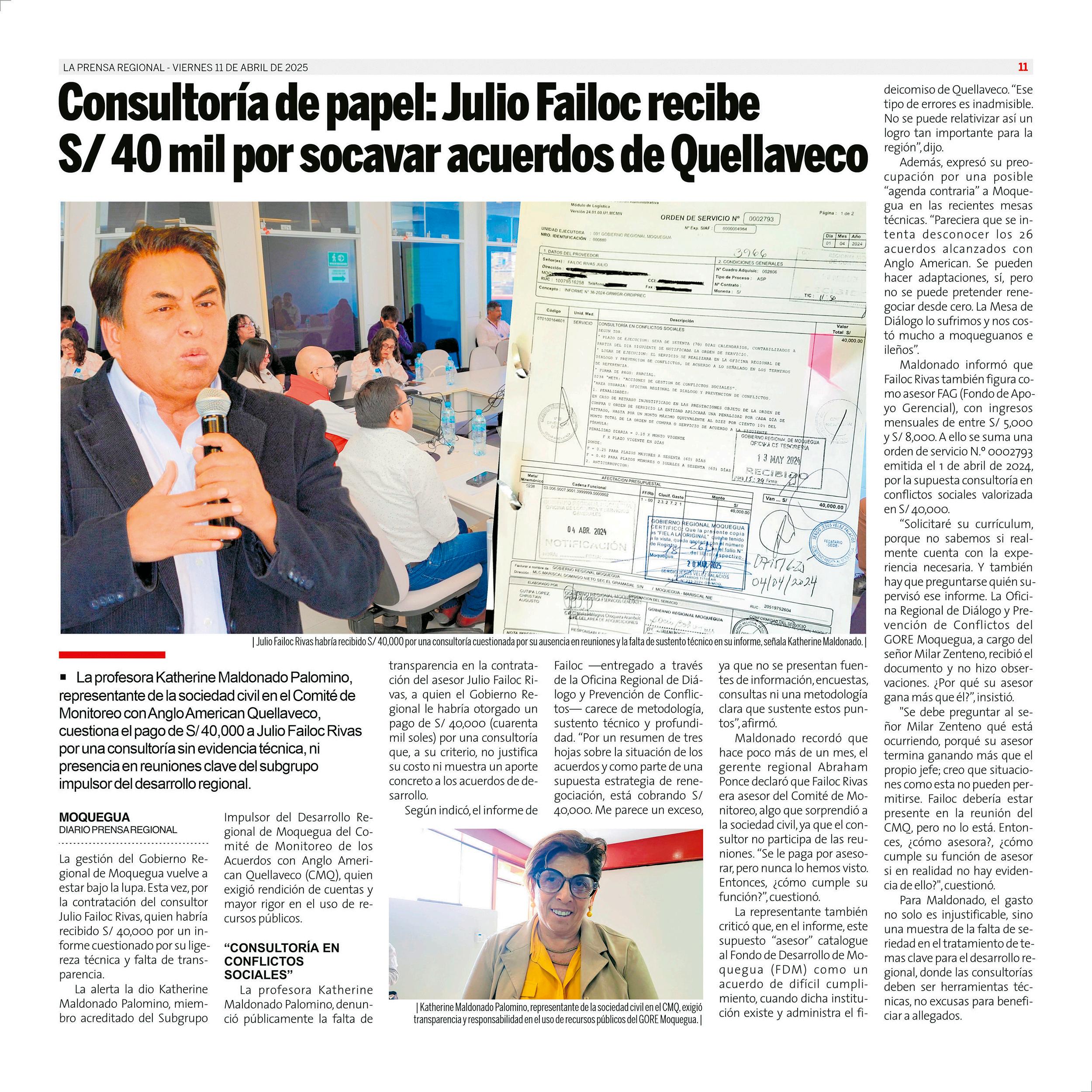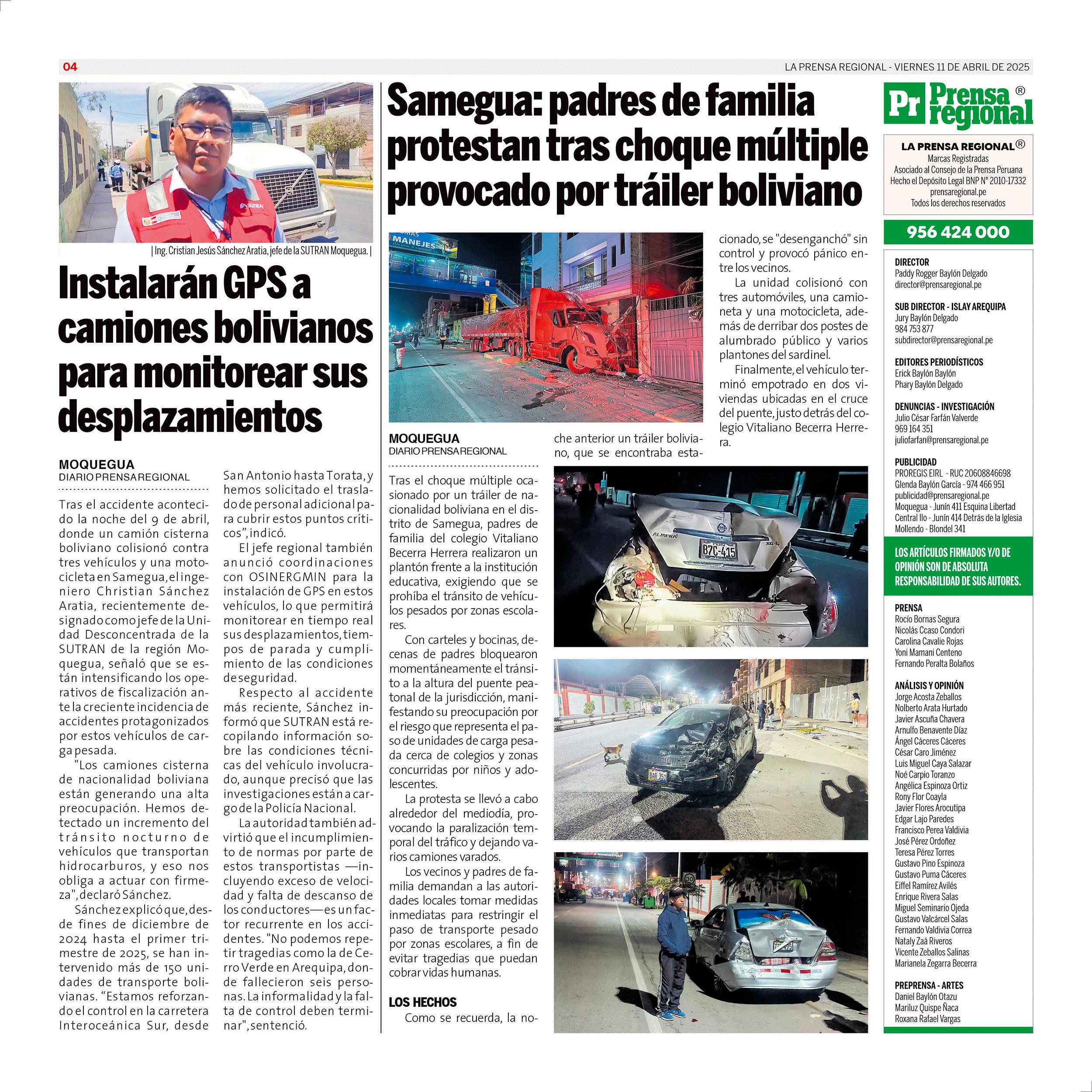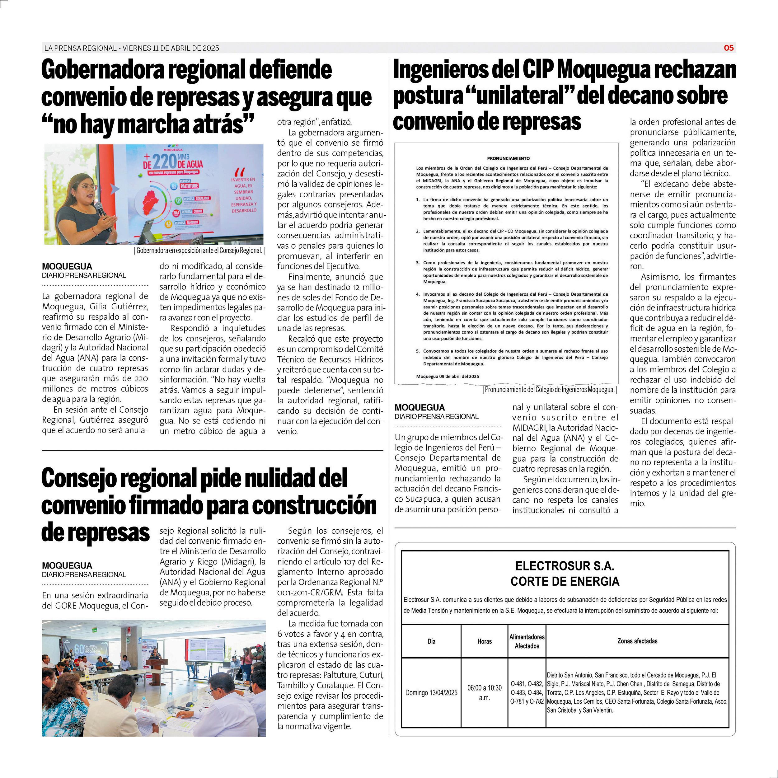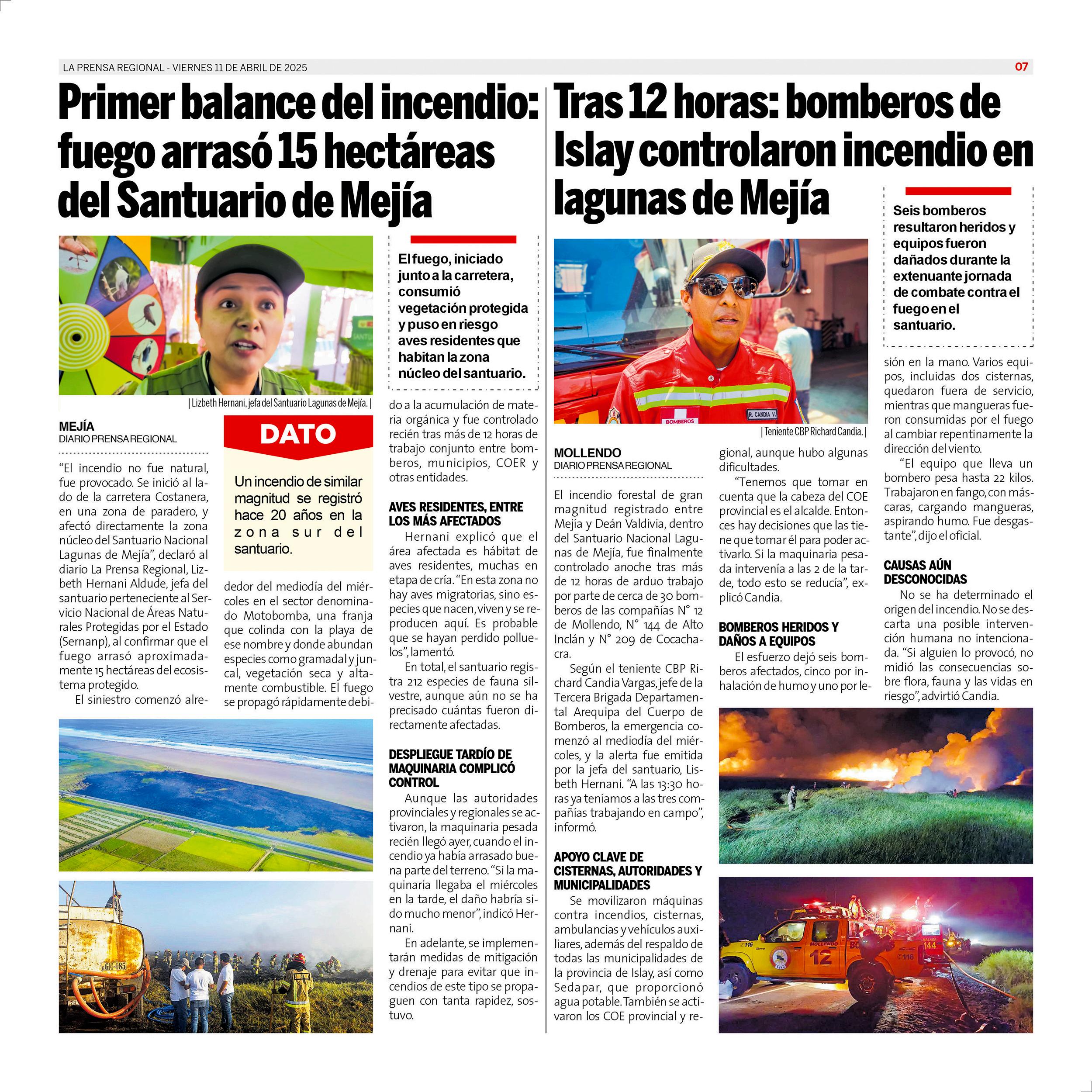La Prensa Regional - Viernes 11 de abril de 2025 https://prensaregional.pe/ #Moquegua, #Ilo, Pacocha, El Algarrobal, Samegua, Torata, Carumas. Omate. #Ichuña. #Islay, Matarani, #Mollendo, Mejia, Cocachacra. #Arequipa, Julio Failoc Rivas, Katherine Maldonado Palomino, Gilia Gutiérrez Ayala, Caja Tacna. Incendio Santuario Lagunas de Mejia.