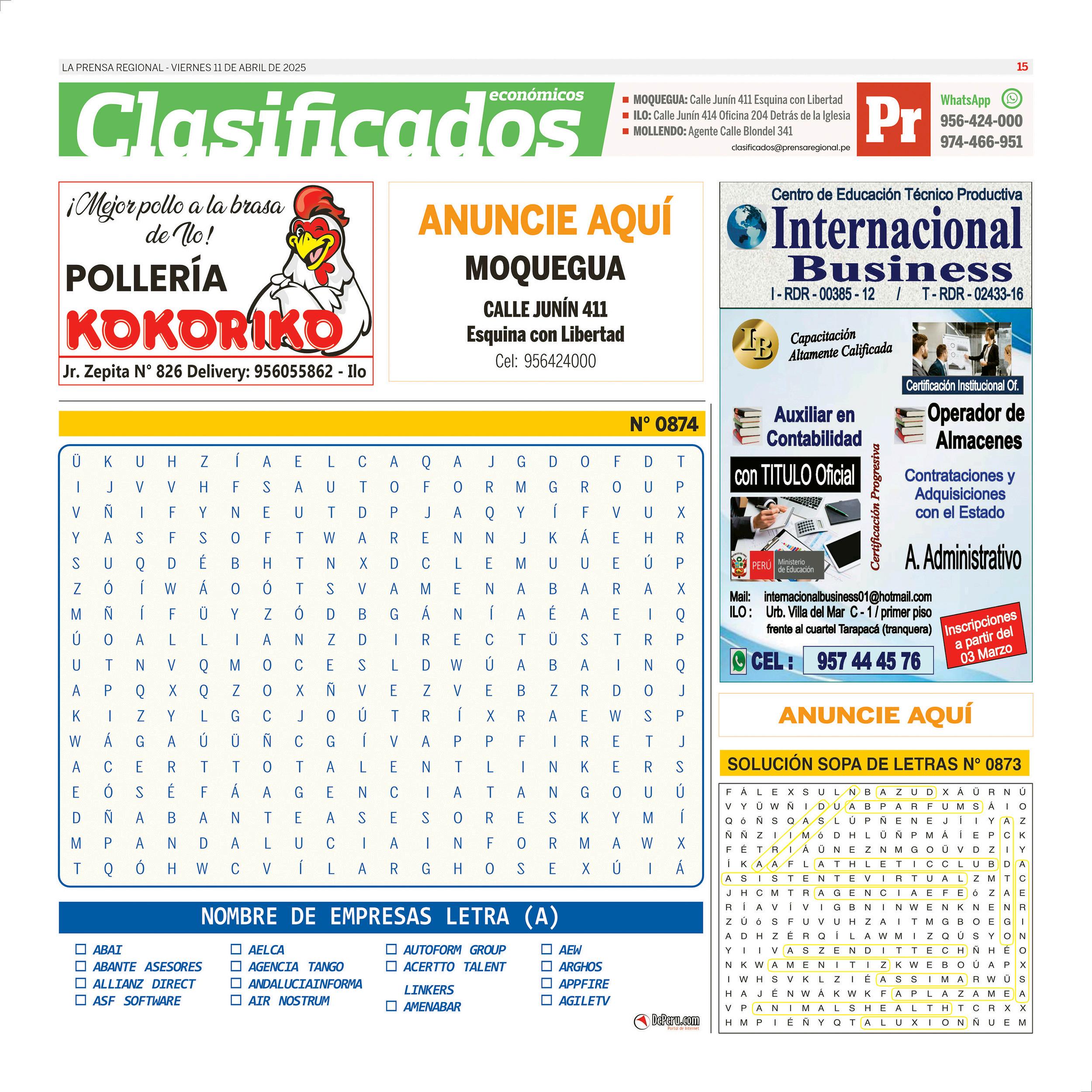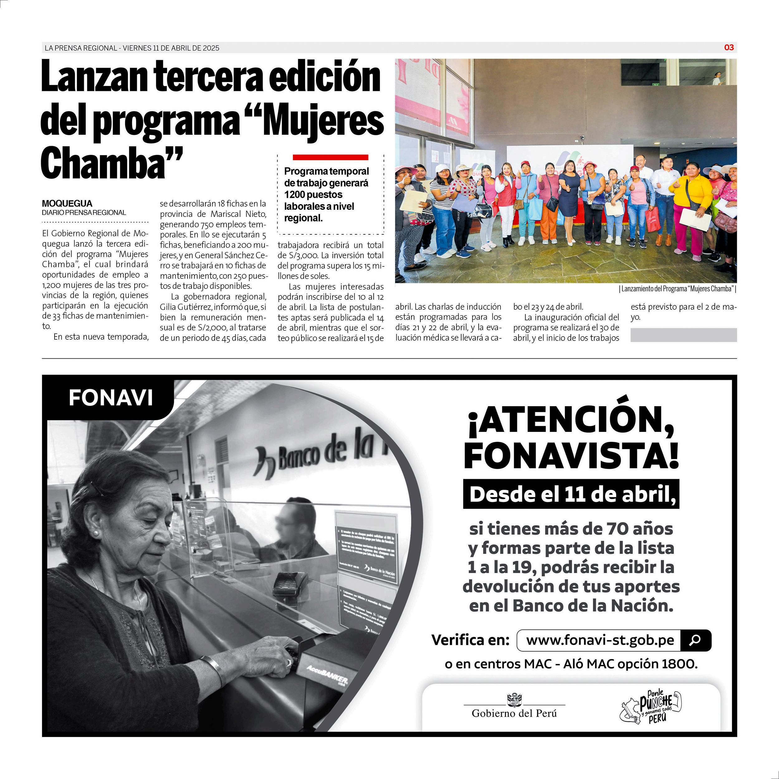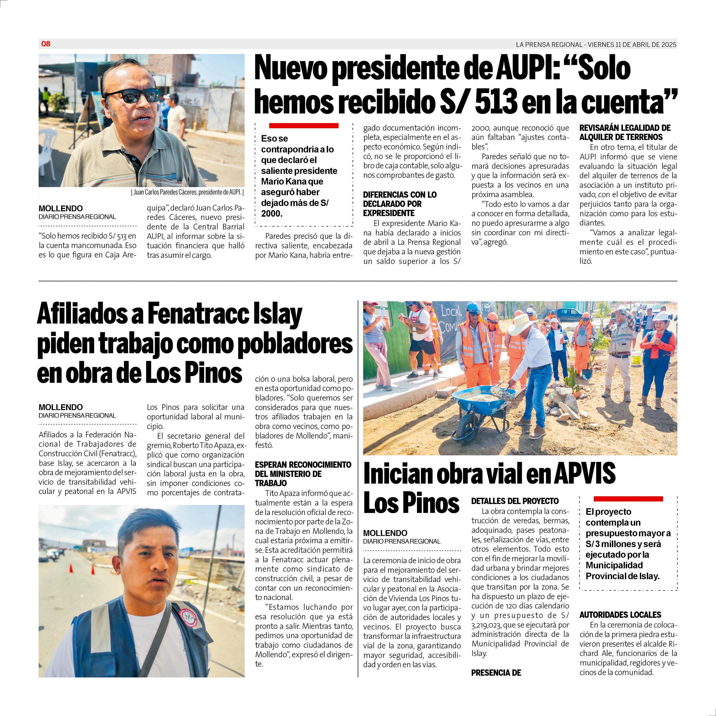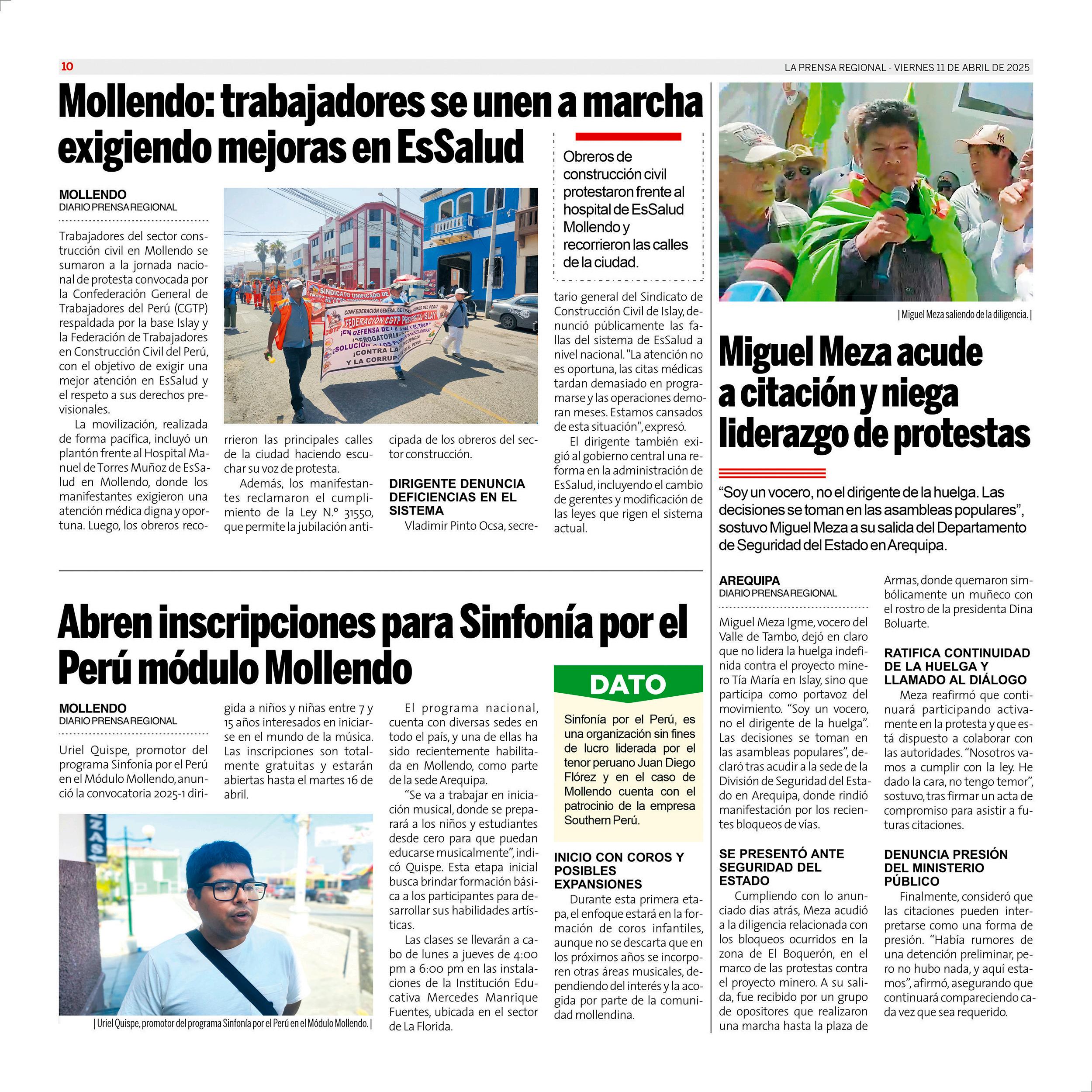 La Prensa Regional - Viernes 11 de abril de 2025 https://prensaregional.pe/ #Moquegua, #Ilo, Pacocha, El Algarrobal, Samegua, Torata, Carumas. Omate. #Ichuña. #Islay, Matarani, #Mollendo, Mejia, Cocachacra. #Arequipa, Julio Failoc Rivas, Katherine Maldonado Palomino, Gilia Gutiérrez Ayala, Caja Tacna. Incendio Santuario Lagunas de Mejia.