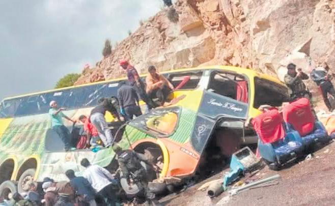 Flores.Launidadchocócontra una peña en la carretera diagonal “Jaime Mendoza”, alturadelalocalidaddeTomaycuri,en la ruta Sucre - Oruro,dejando 13 personas fallecidas y 20heridas.