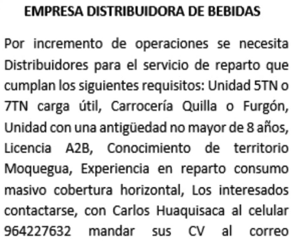 (Distribuidor Coca-Cola) solicita Conductores AIIIC y Ayudantes de Reparto para Moquegua. Ofrecemos ingreso a planilla, sueldos fijos mas comisiones y tarjeta de alimentos. Ubicados en Av.La Paz 1205 a espaldas del Terminal. Comunicarseal919083604. 03D/22-25/OCT