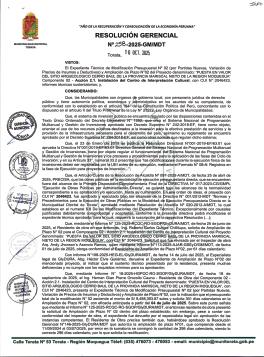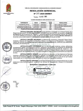 LaMunicipalidadDistritaldeTorataaprobóelpasado10deoctubre, mediante la Resolución de Gerencia Municipal N.° 2582025-MDT/GM,unanuevamodificación presupuestal y ampliacióndeplazoparaelproyecto “Puesta en valor del sitio arqueológico Cerro Baúl”, específicamenteensucomponente2, que comprende la instalación del Centro de Interpretación Cultural.