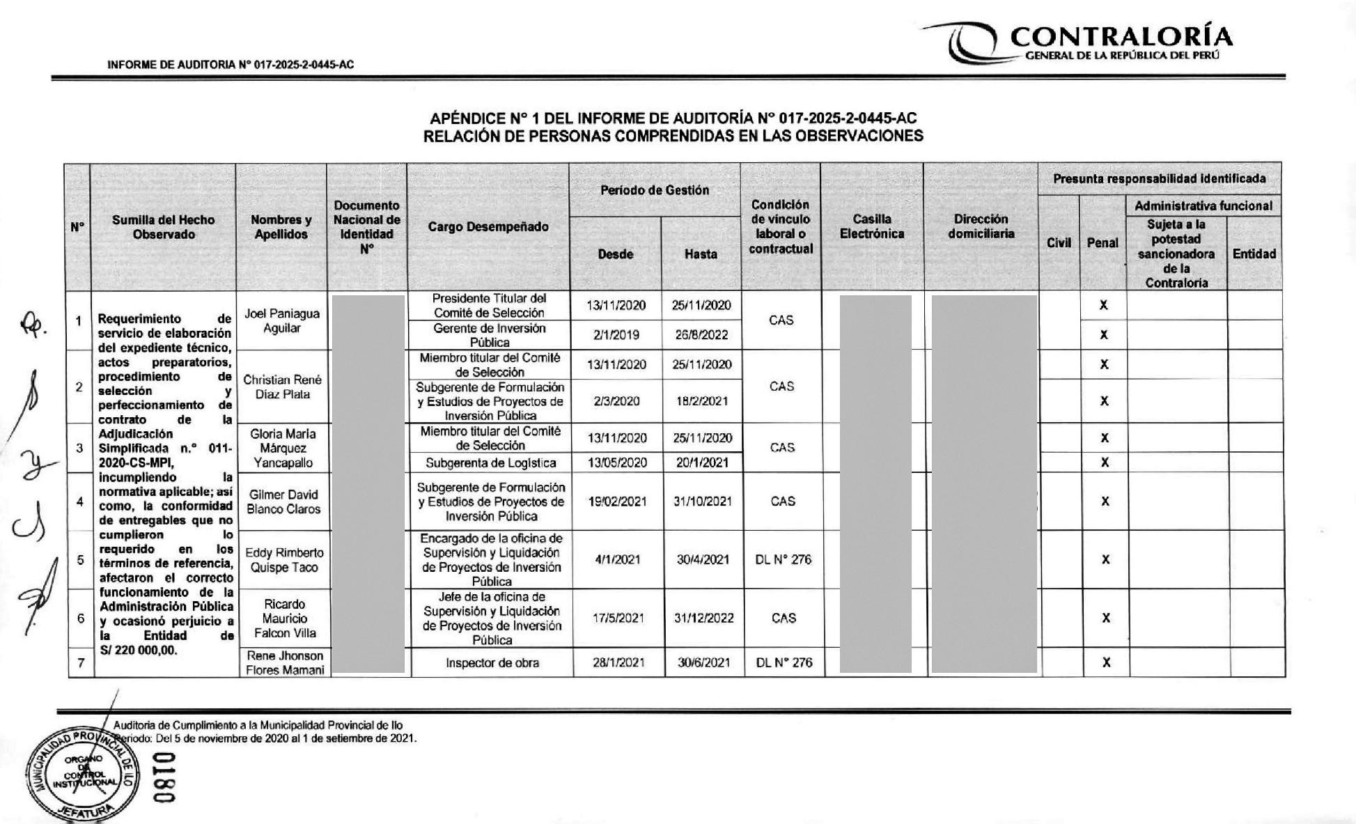 donde se determinó un perjuicio económico de S/ 220 mil y la presunta responsabilidadpenaldesieteexfuncionariosmunicipales. El informe de control advierte deficiencias en los términosdereferencia,faltade experiencia de los postores y un expediente técnico que no cumplía con las normas del