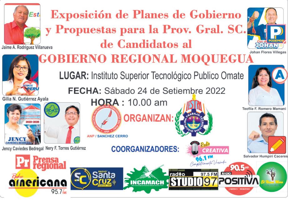 Para este sábado 24 de setiembre se realizaráelúltimo debate de candidatos regionales en la provincia General Sánchez Cerro. Bajo la organización de los periodistas agremiados a la ANP,el acto tendrá lugar en el tecnológicodelpueblo.